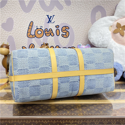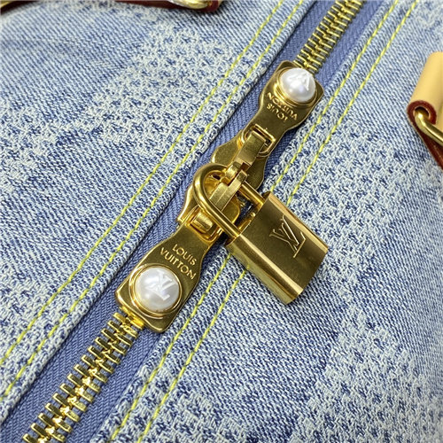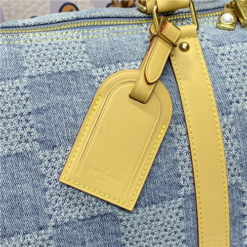 The Damier pattern comes to the Keepall Bandoulière 50 with summery Damier Denim 3D cotton canvas. To create this canvas, the organic cotton base is cut, bleached, and dyed to achieve a washed-out aspect. Then it’s washed again to slightly shrink the material and reveal its 3D texture. The bag’s two zip-pulls are incrusted with pearls.