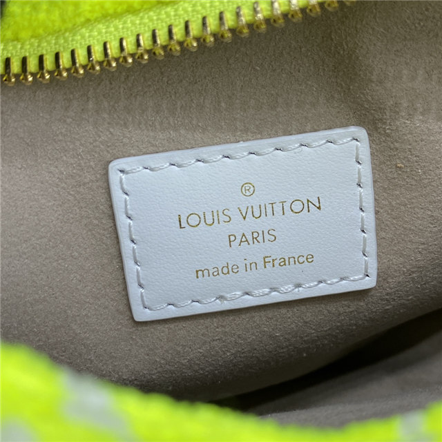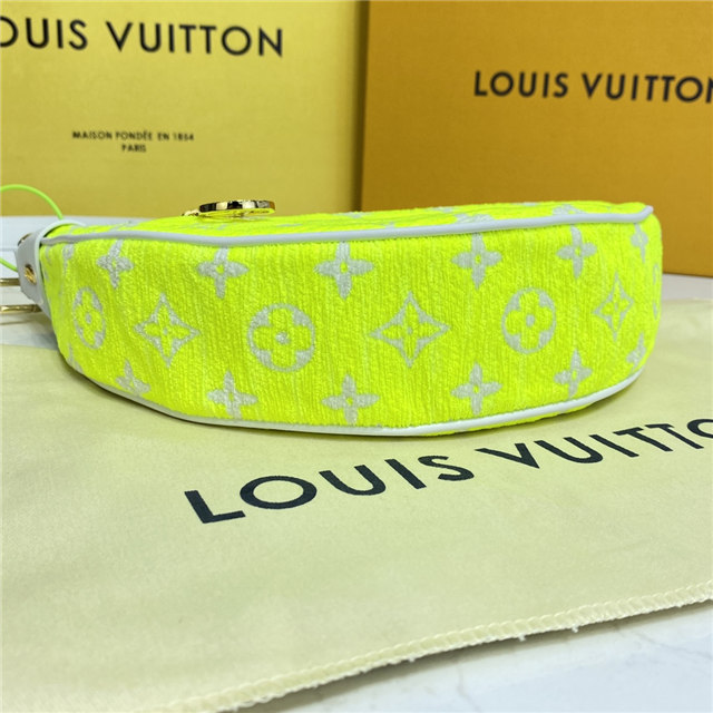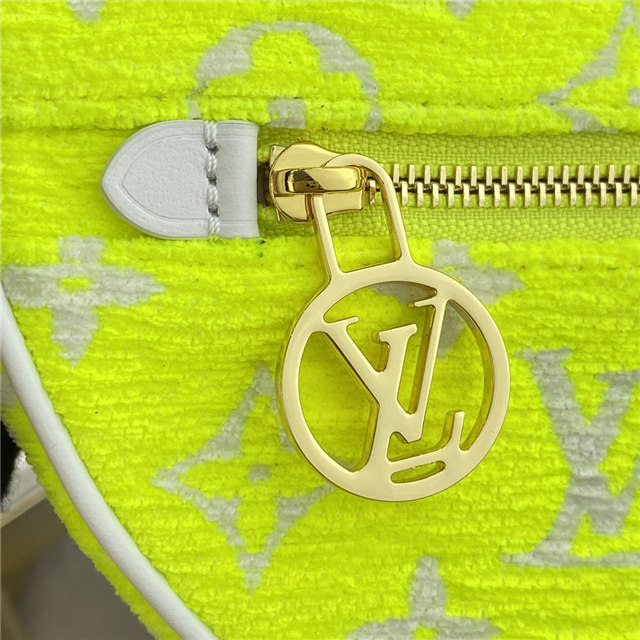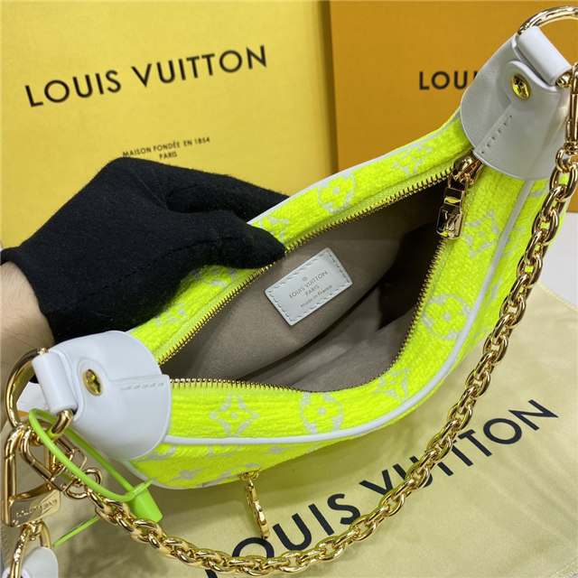 The Loop half-moon baguette bag is fashioned from Monogram jacquard velvet in a bright yellow color, reminiscent of the iconic yellow of tennis balls. The jacquard velour is a 100% sustainable material made from recycled yarn.