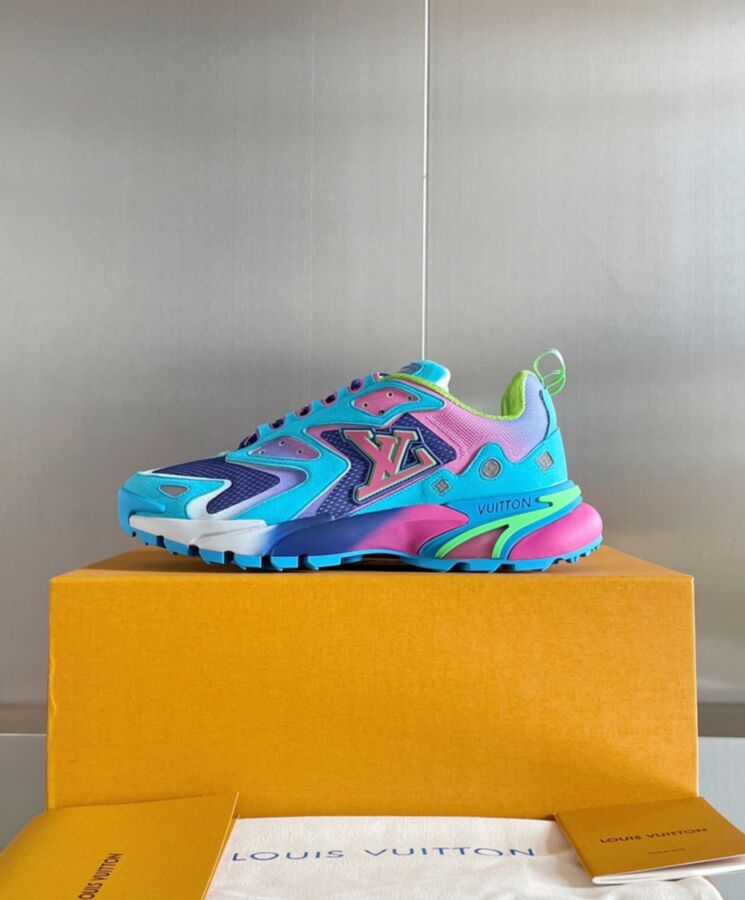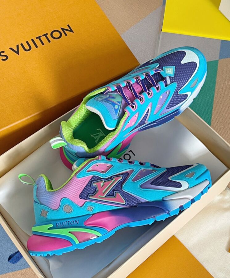 Inspired by running shoes, the LV Runner Tatic sneaker was first seen at Louis Vuitton’s Spring-Summer 2022 men’s show. This version comes in technical mesh and calf leather with bold color gradations. It is signed with a dynamic LV Initials logo and reflective Monogram Flowers on the side, while the outsole bears the Vuitton signature.