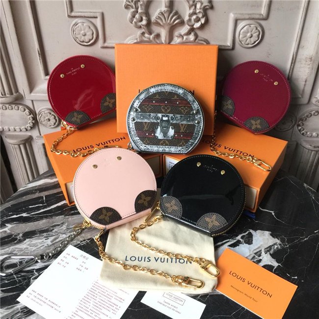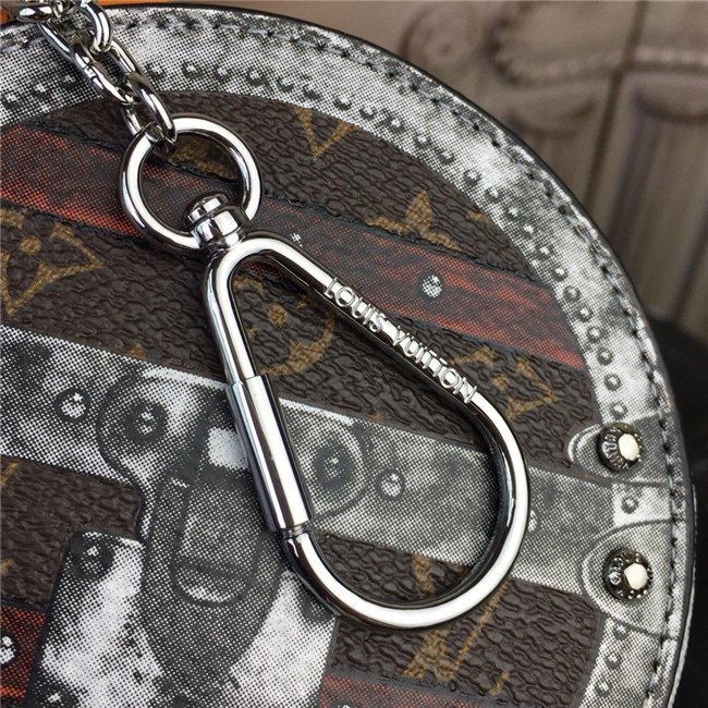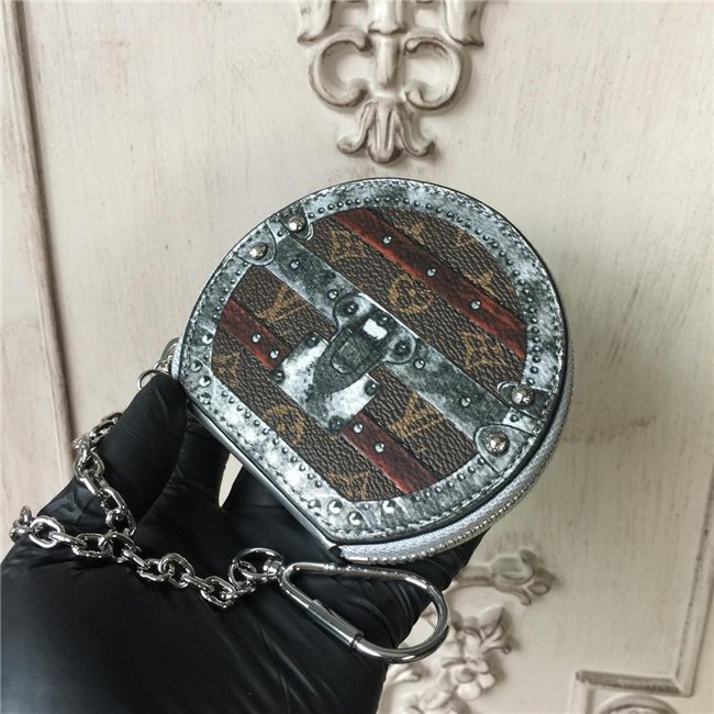 The Time Trunk Micro Boite Chapeau purse is part of a collection referencing Louis Vuitton”s Fall-Winter 2018-19 fashion show, at which Nicolas Ghesquire revisited the historic trunks. It is crafted from transformed Monogram canvas with trompe-l”?il detailing for a vintage look. This miniature hatbox can be hooked onto a bag or belt.