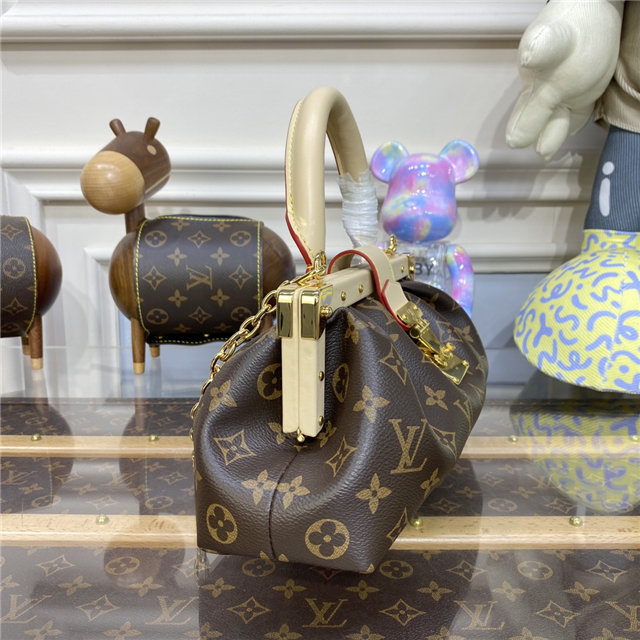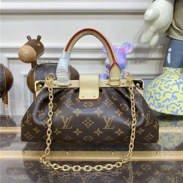 Seen at the Spring-Summer 2023 show, the Monogram Clutch is fashioned from Monogram canvas with natural calfskin trim and gold-color hardware, including the classic Louis Vuitton S-lock and the riveted clasp with metallic corners. In addition to the rolled-leather top handle, there’s a removable chain, attached to retractable, rotating chain mounts
