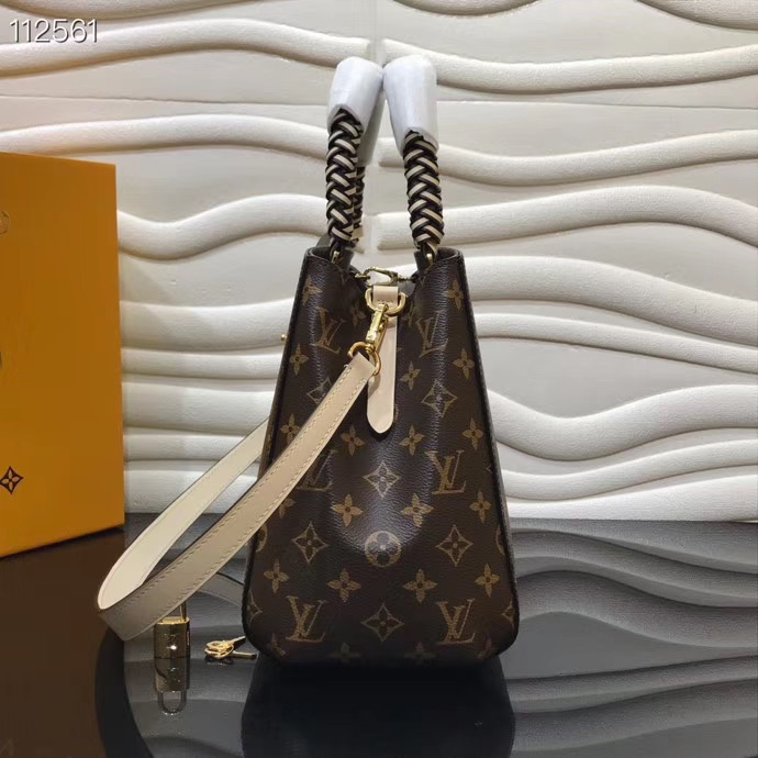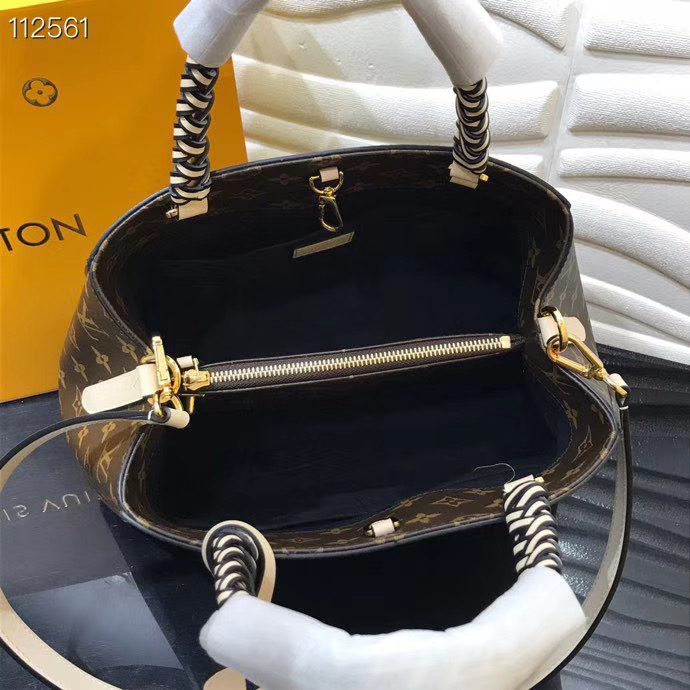 The two exquisitely crafted, braided-leather top handle give this Montaigne MM bag in Monogram canvas a modern twist, empathized by the oversized LV charm. The cream-colored removable leather strap completes the picture. The functional interior, including multiple pockets and compartments, makes it a great everyday bag.