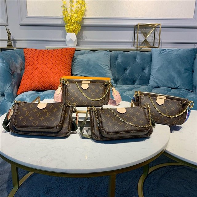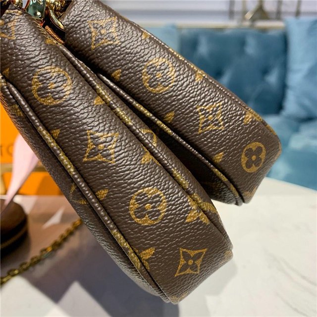 The Multi Pochette Accessoires is a hybrid cross-body bag with multiple pockets and compartments that brings together a Pochette Accessoires, a Mini Pochette Accessoires and a Round Coin Purse. Fashioned from Monogram canvas with a mini Monogram pattern on the sides of the two pochettes, it has both a removable gold-tone chain and an adjustable Louis Vuitton inscribed Jacquard strap for multiple carrying options.