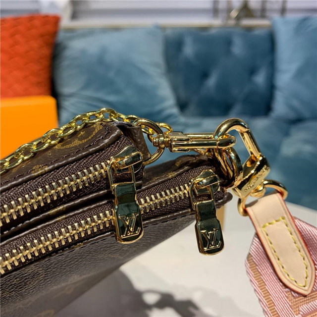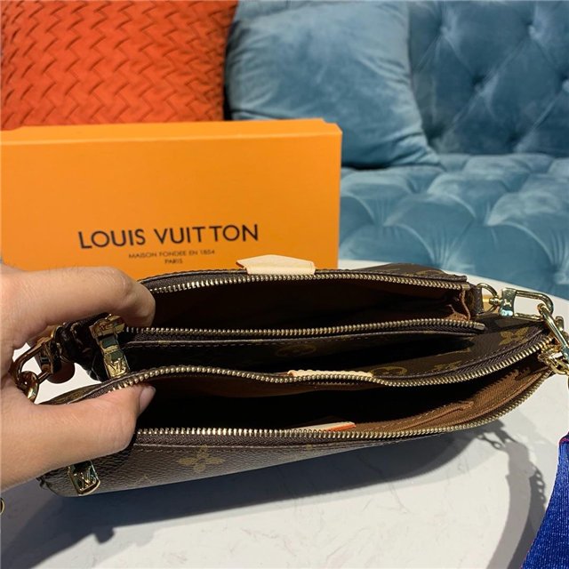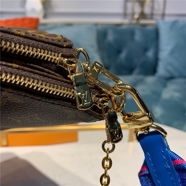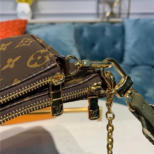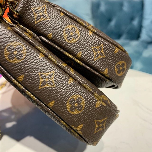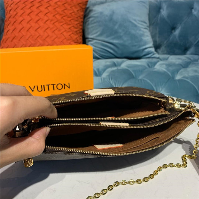 The Multi Pochette Accessoires is a hybrid cross-body bag with multiple pockets and compartments that brings together a Pochette Accessoires, a Mini Pochette Accessoires and a Round Coin Purse. Fashioned from Monogram canvas with a mini Monogram pattern on the sides of the two pochettes, it has both a removable gold-tone chain and an adjustable Louis Vuitton inscribed Jacquard strap for multiple carrying options.