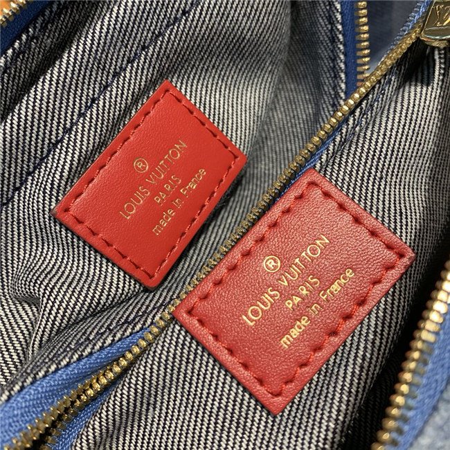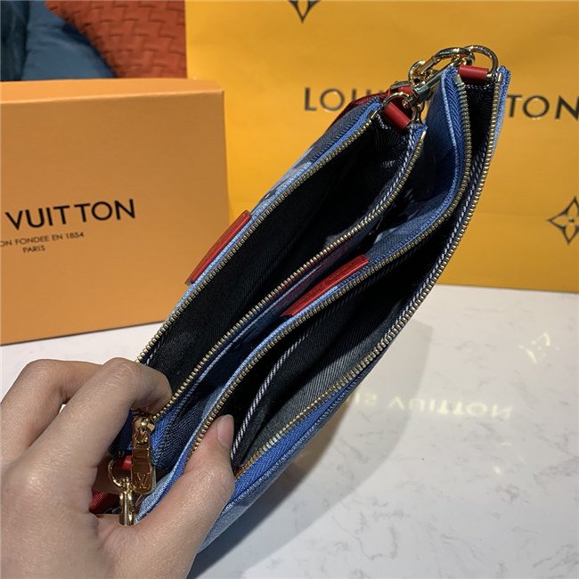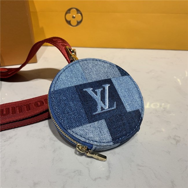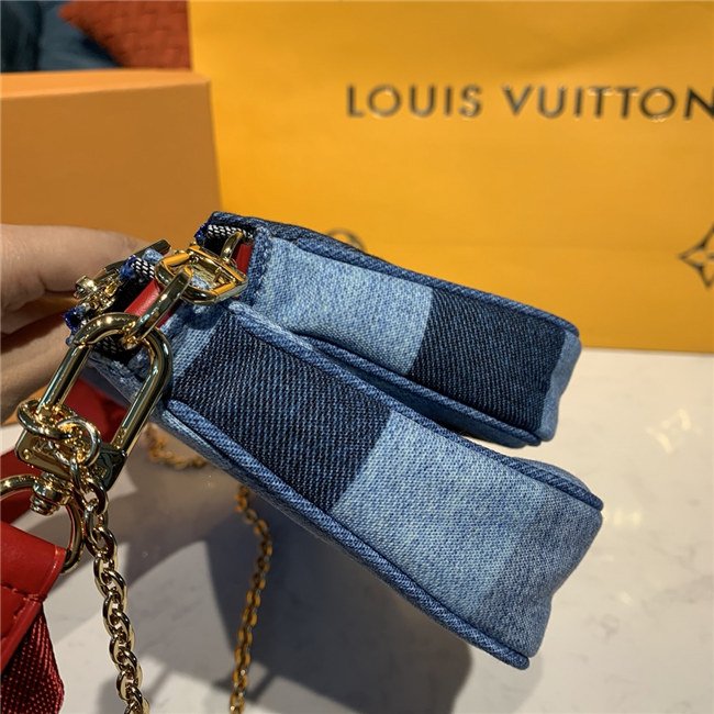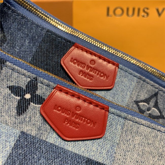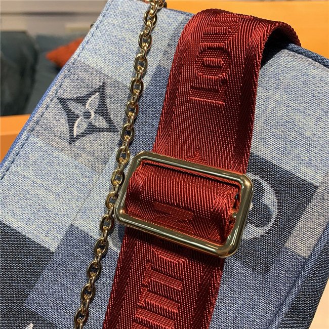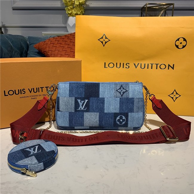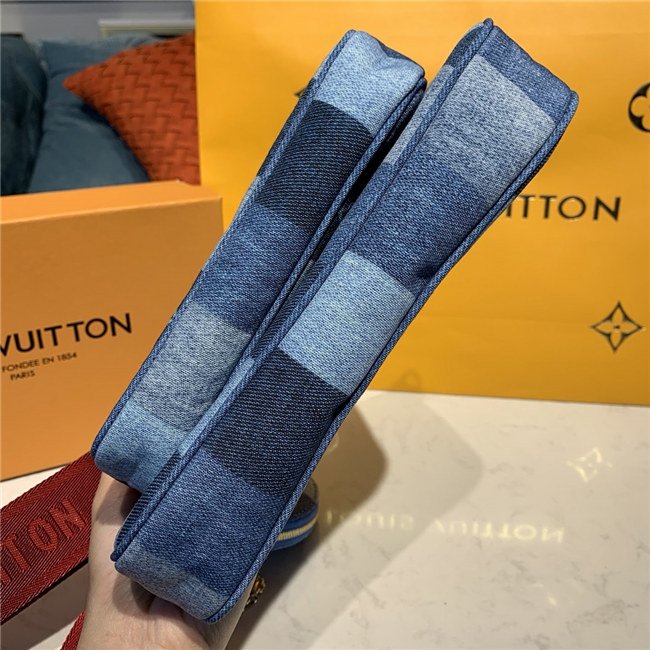 Accessoires. Attached to (and detachable from) a red jacquard strap, the elements are crafted from canvas printed with a patchwork of Damier and Monogram motifs. The gradient shades of denim blue produce an eye-catching illusion of texture, for a chic yet casual allure.
