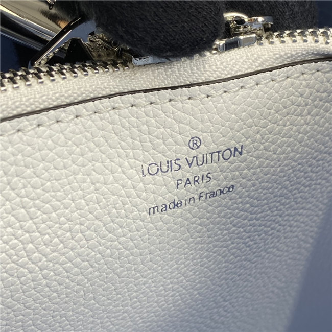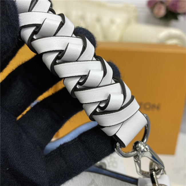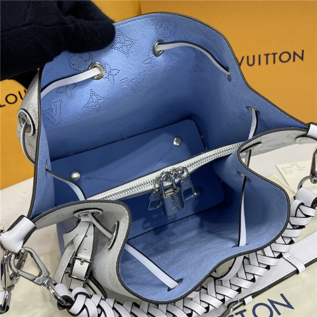 The Muria bucket bag is made from Mahina calf leather with a gradient color treatment from pastel to neutral. Combined with the calf leather’s perforated Monogram motif, the effect is dazzling. The Muria can be carried by hand with the braided top handle or worn with its long leather strap.