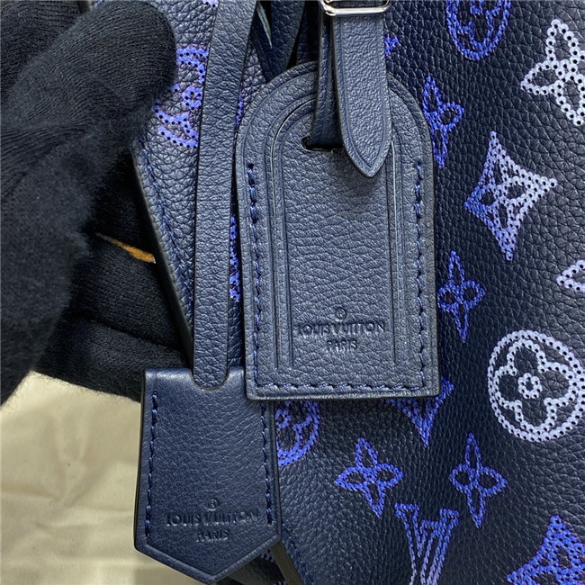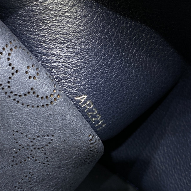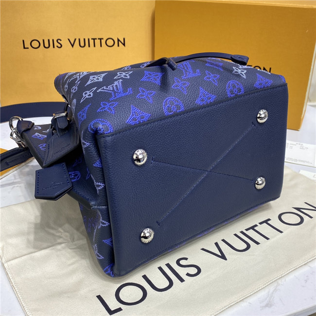 Perfect for plane travel, the Muria tote bag is made from supple Mahina perforated calfskin. The perforated Monogram pattern in the navy-blue calfskin is highlighted by the gradient whites and blues on the LVs and Monogram Flowers. A braided handle enables hand and elbow carry while a removable leather strap allows comfortable shoulder and cross-body wear.