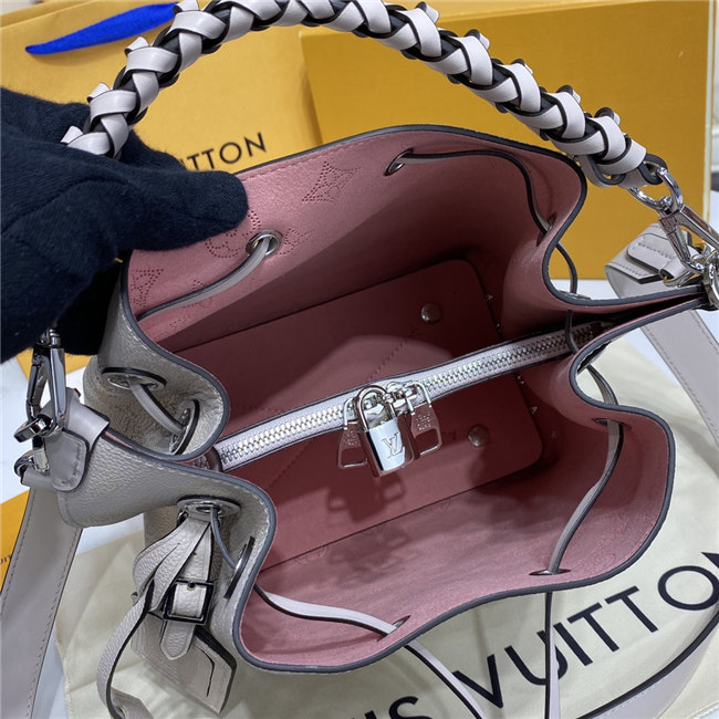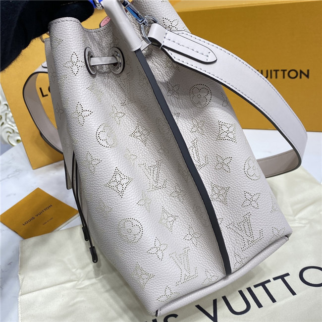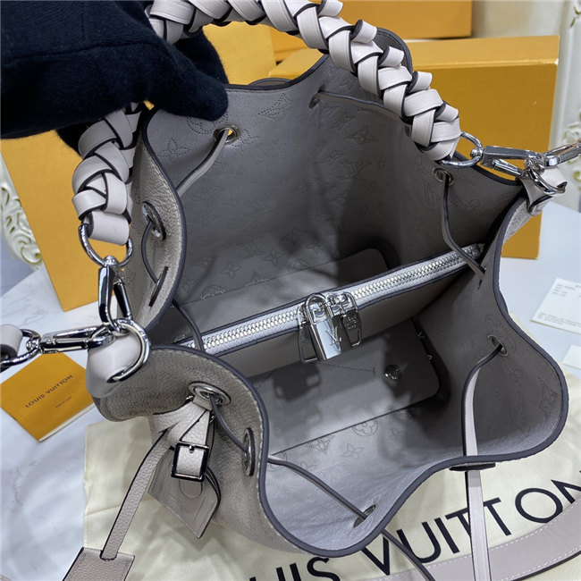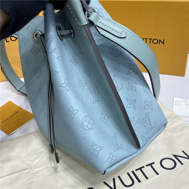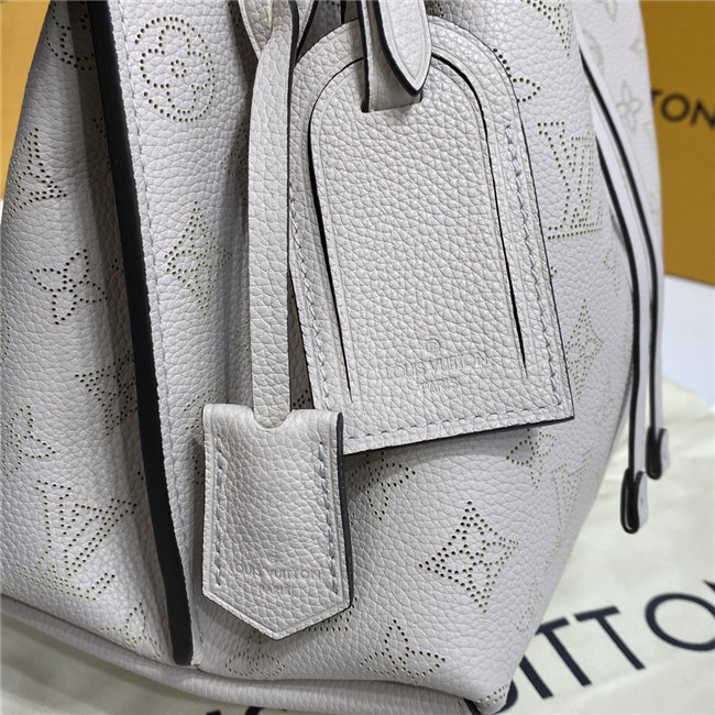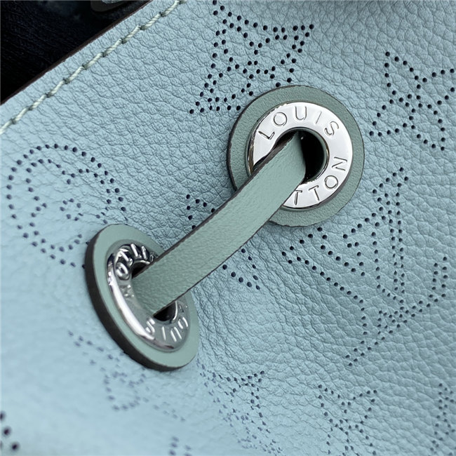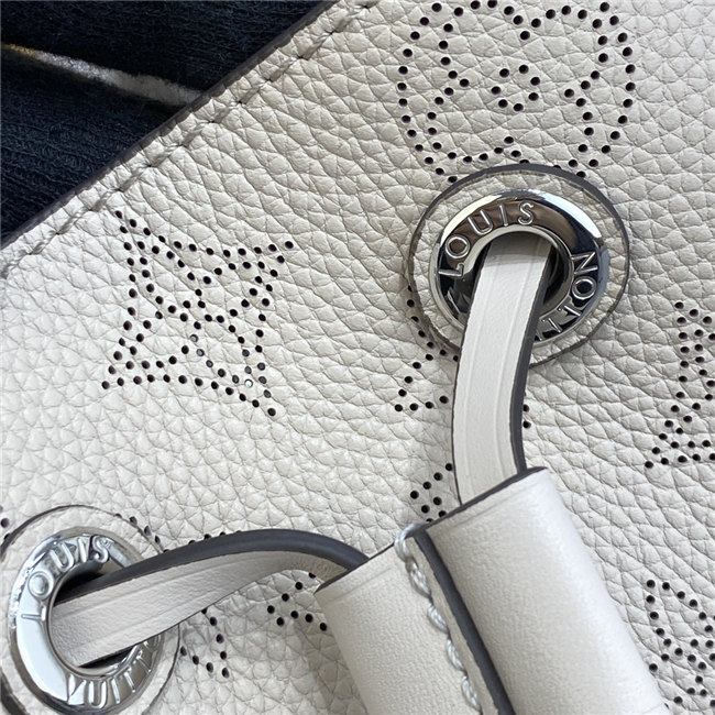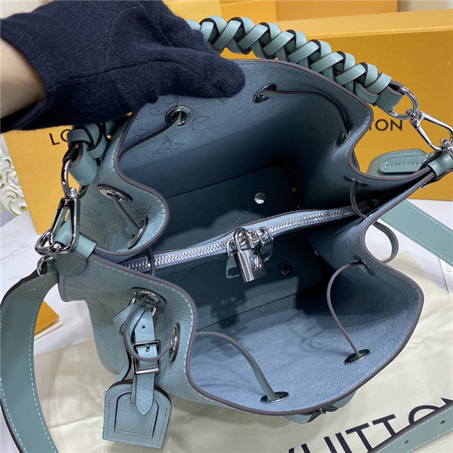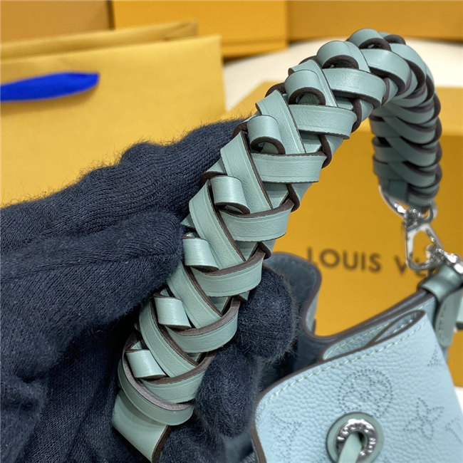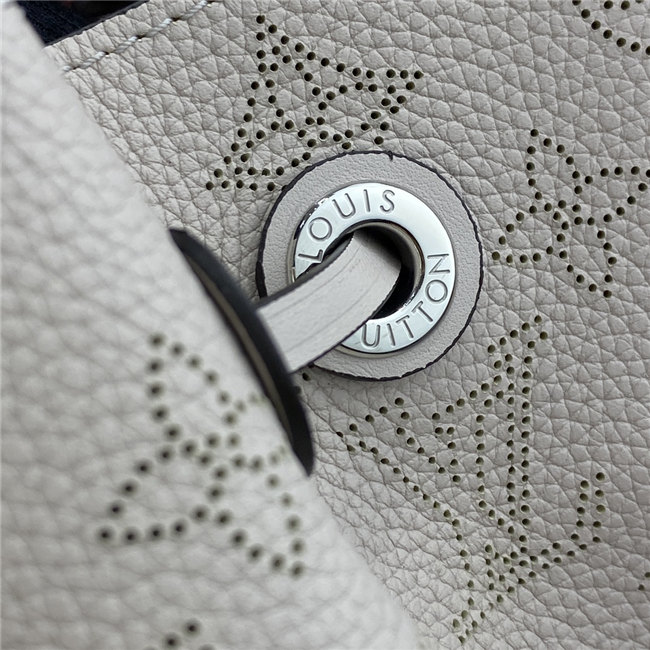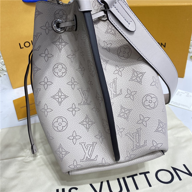 The Muria bucket bag is made from Mahina leather, calf leather with a perforated Monogram pattern, in a metallic sheen. It features both a braided top handle and a long adjustable leather strap for short- and long-shoulder carry as well as cross-body wear. Its leather name tag and key bell bring an added touch of sophistication.
