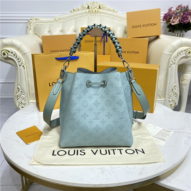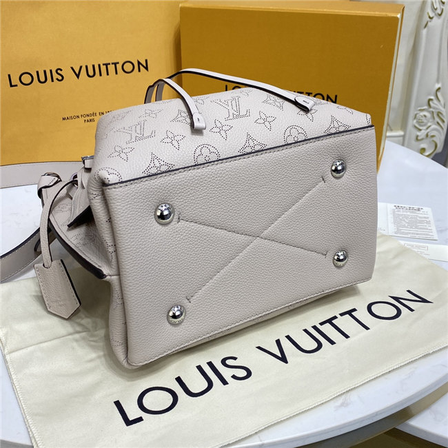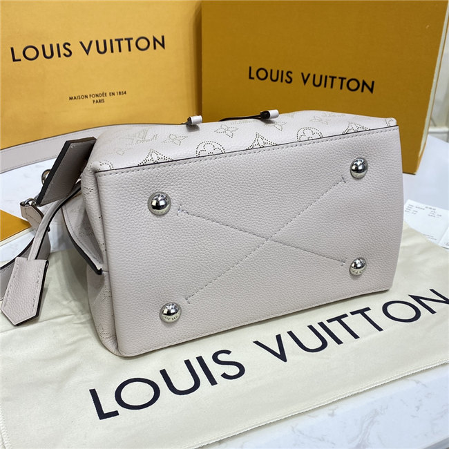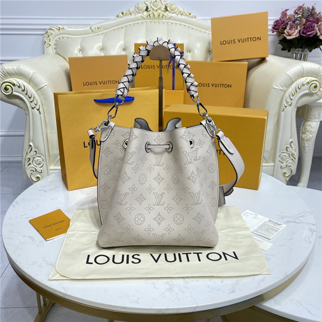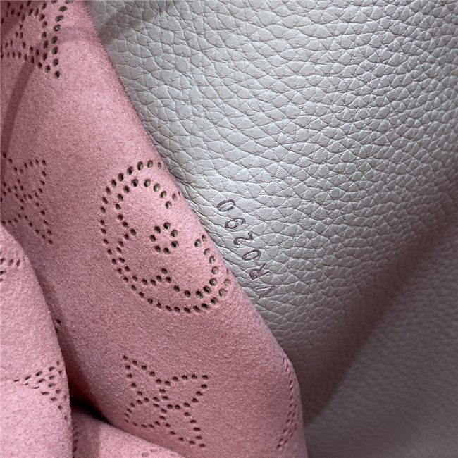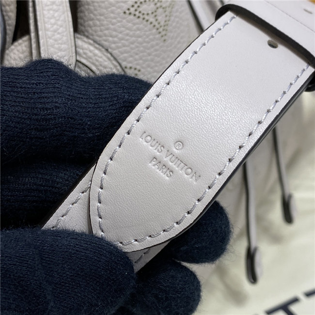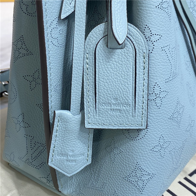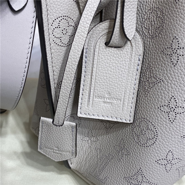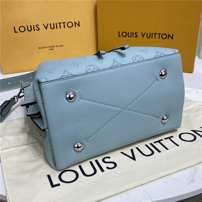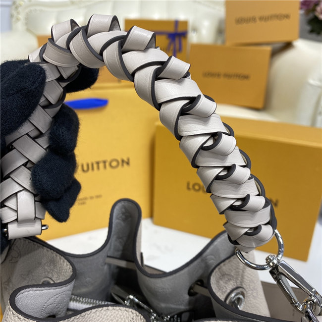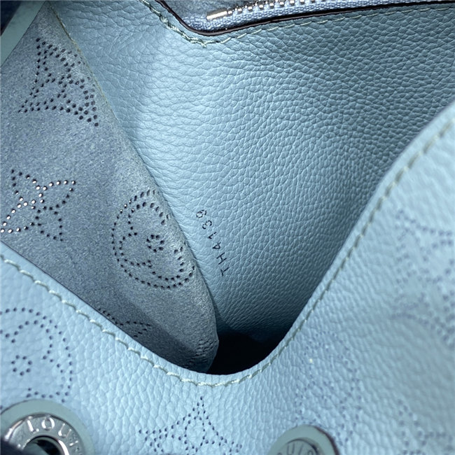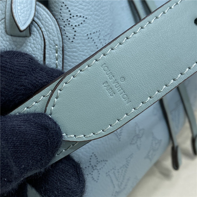The Muria bucket bag is made from Mahina leather, calf leather with a perforated Monogram pattern, in a metallic sheen. It features both a braided top handle and a long adjustable leather strap for short- and long-shoulder carry as well as cross-body wear. Its leather name tag and key bell bring an added touch of sophistication.