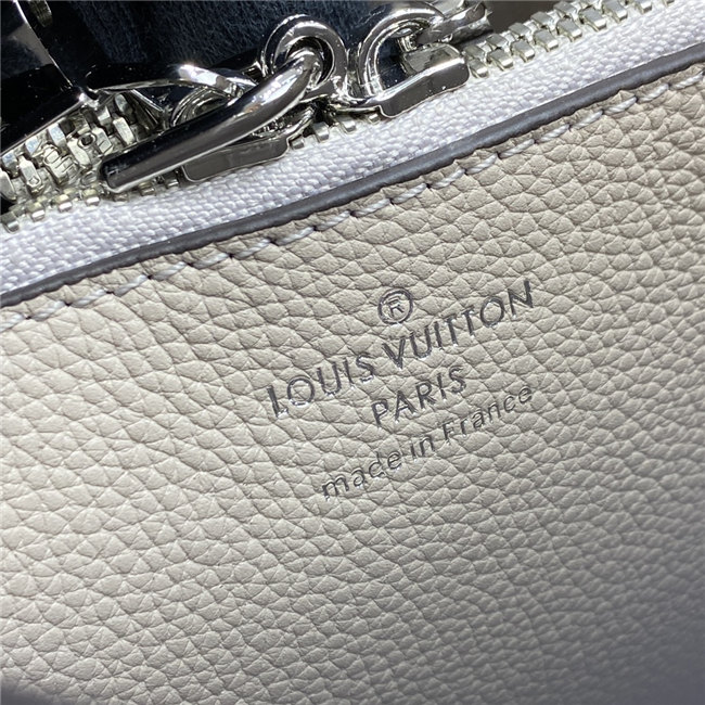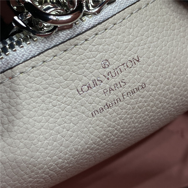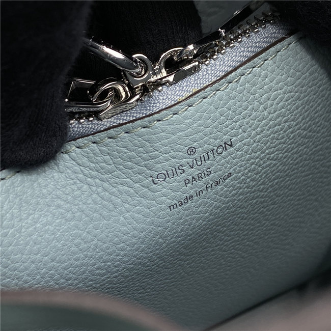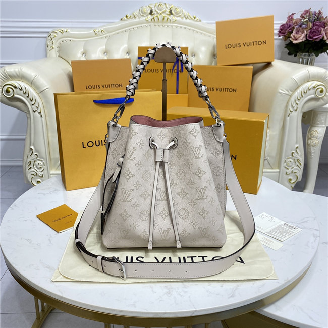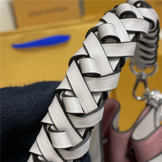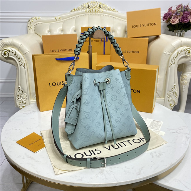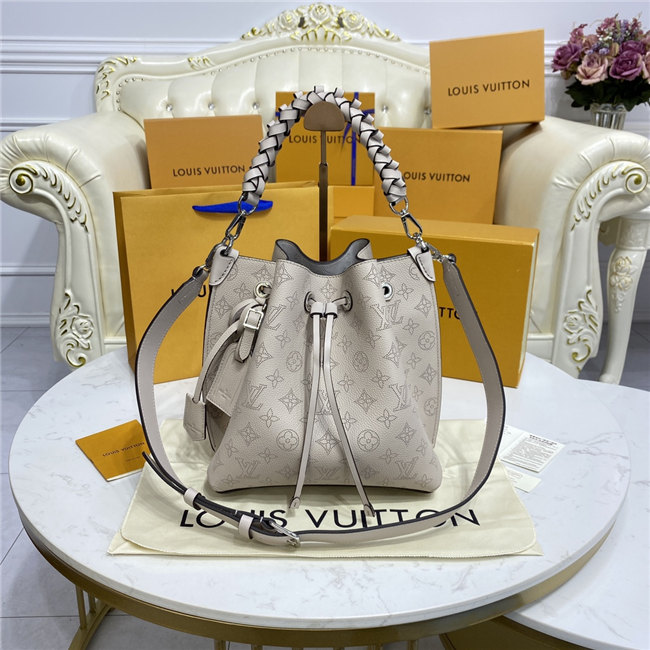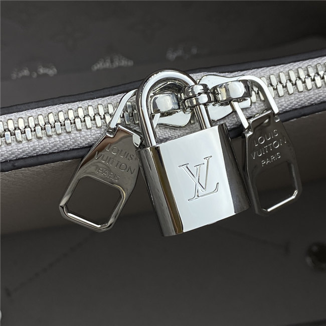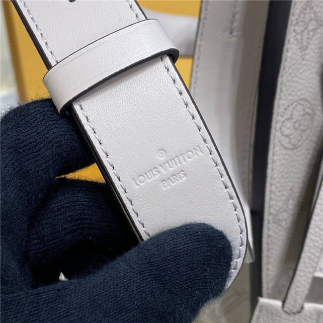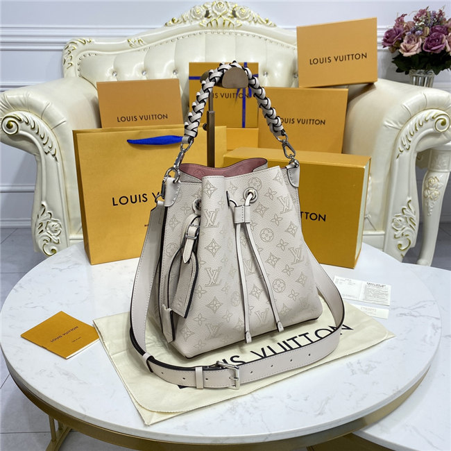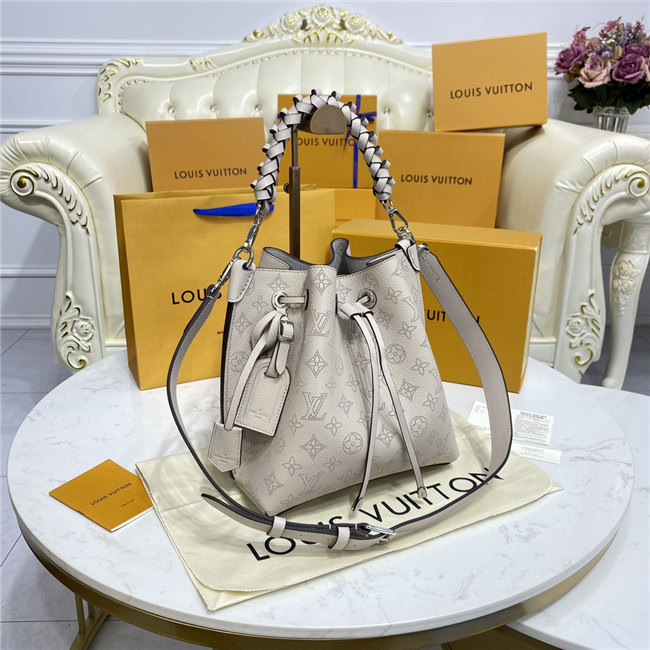 The Muria bucket bag is made from Mahina leather, calf leather with a perforated Monogram pattern, in a metallic sheen. It features both a braided top handle and a long adjustable leather strap for short- and long-shoulder carry as well as cross-body wear. Its leather name tag and key bell bring an added touch of sophistication.