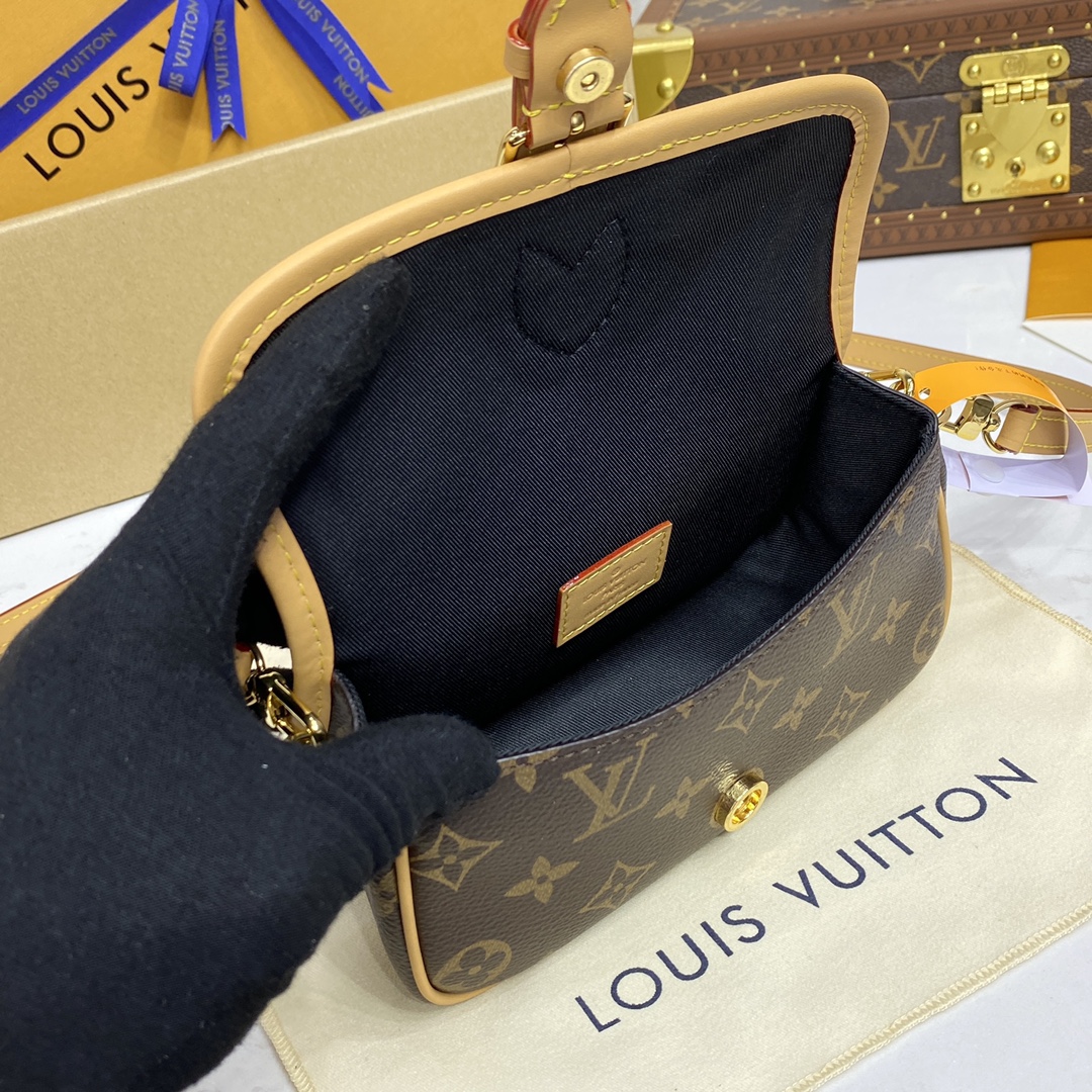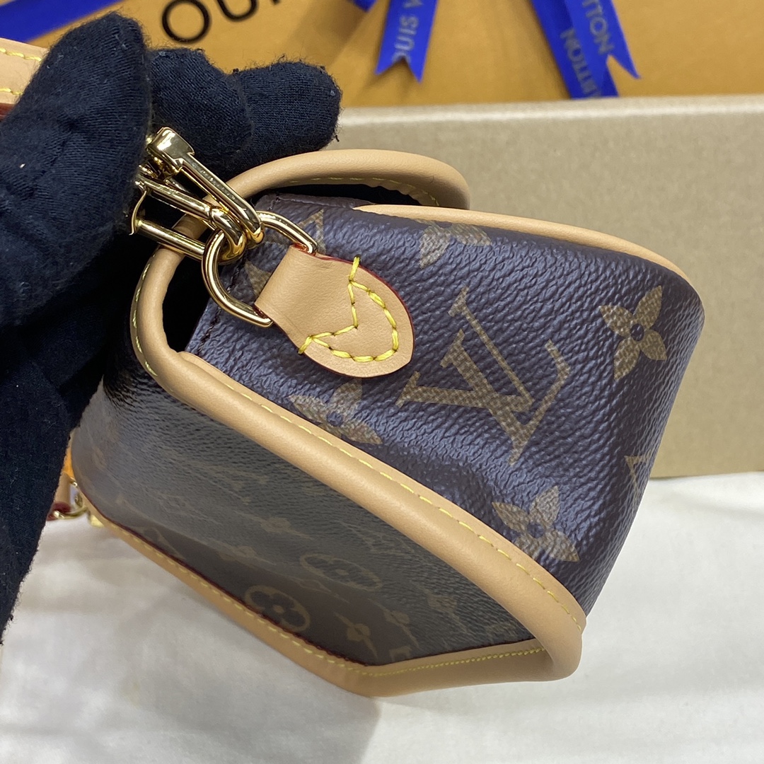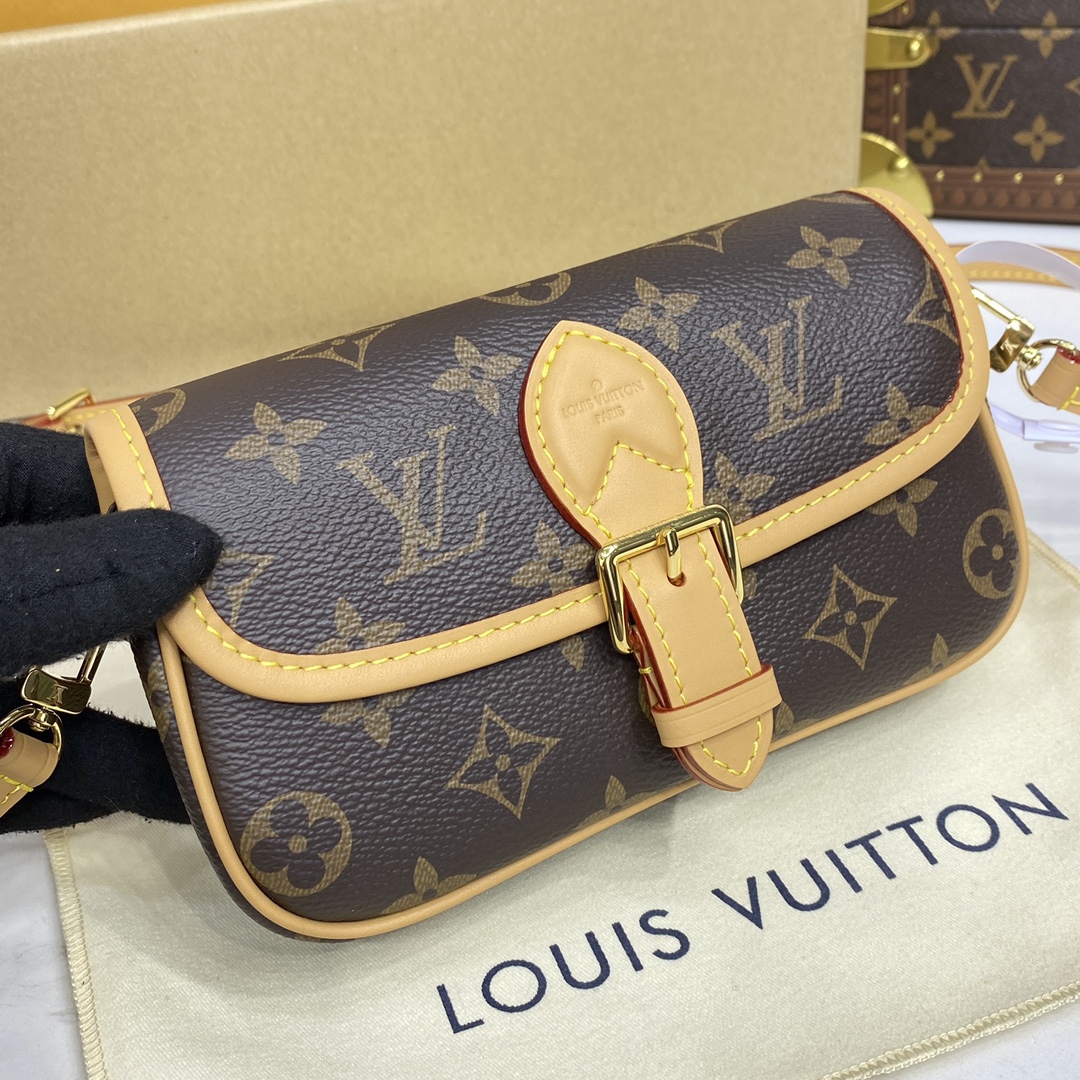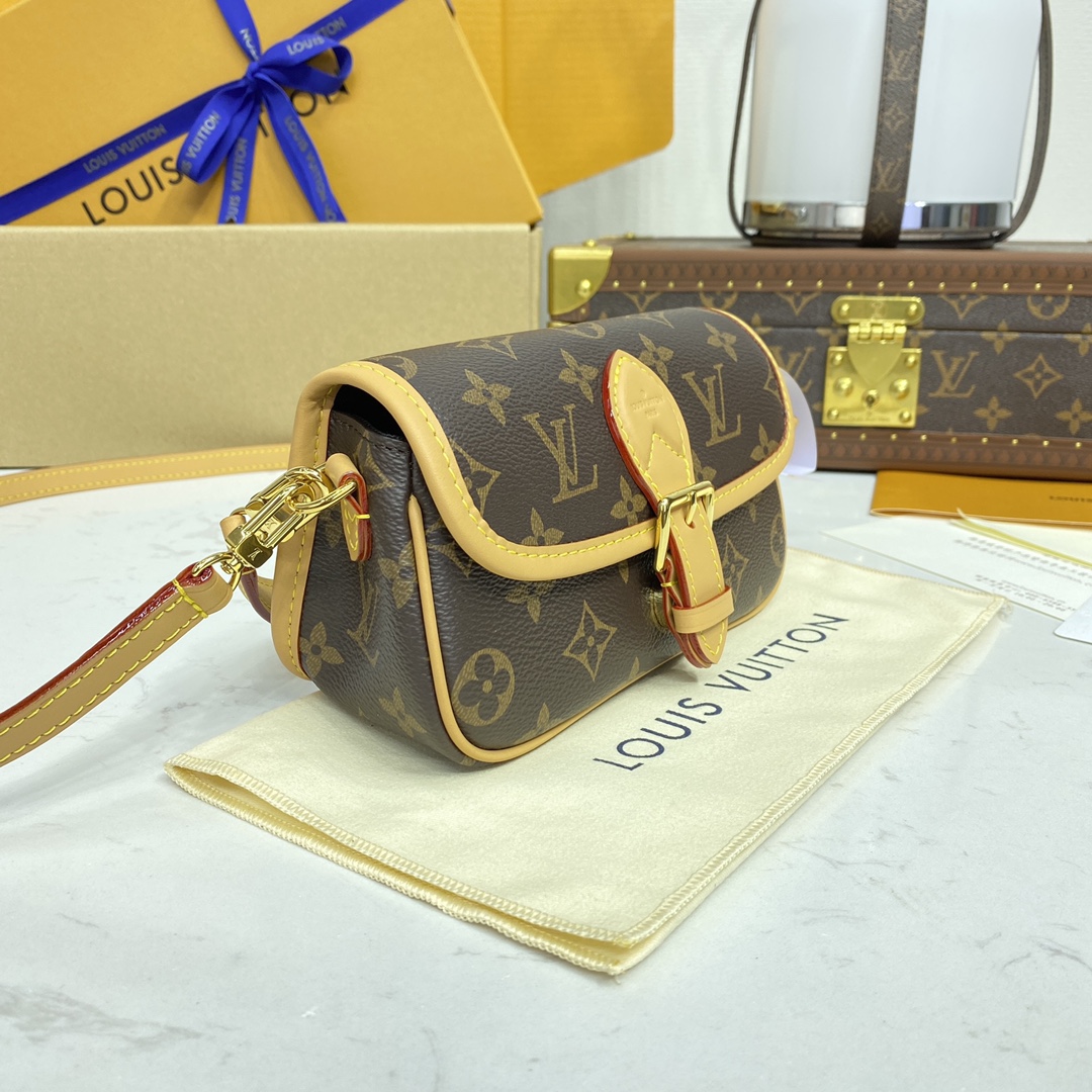 A miniature version of the Diane bag, the Nano Diane comes in Louis Vuitton’s iconic Monogram canvas. Ideal for essentials including a phone, this model is complemented by natural leather trim, which highlights its distinctive rounded flap and magnetic, belt-style closure. A removable handle and removable, adjustable shoulder strap offer different carry options.