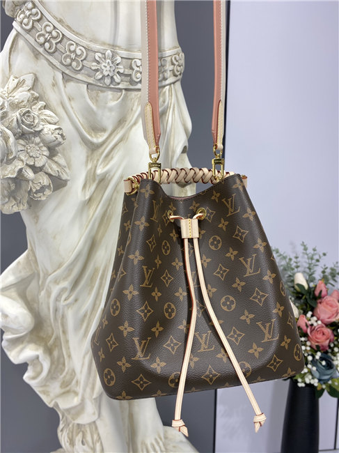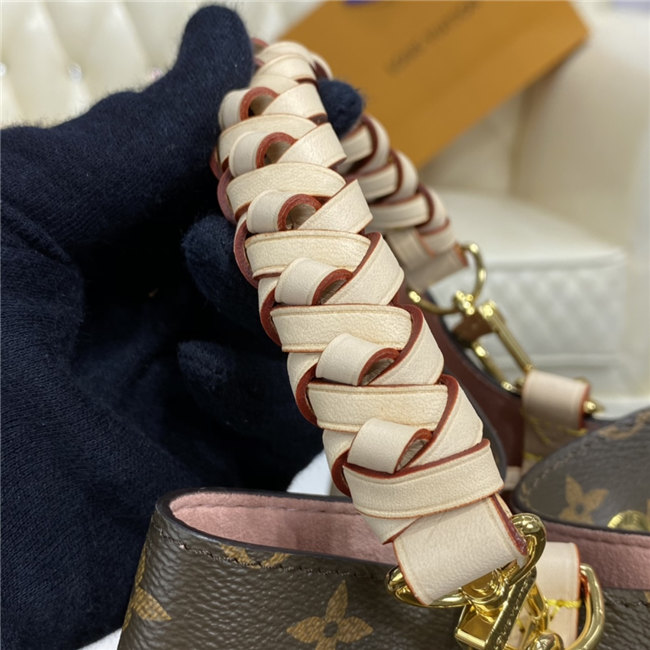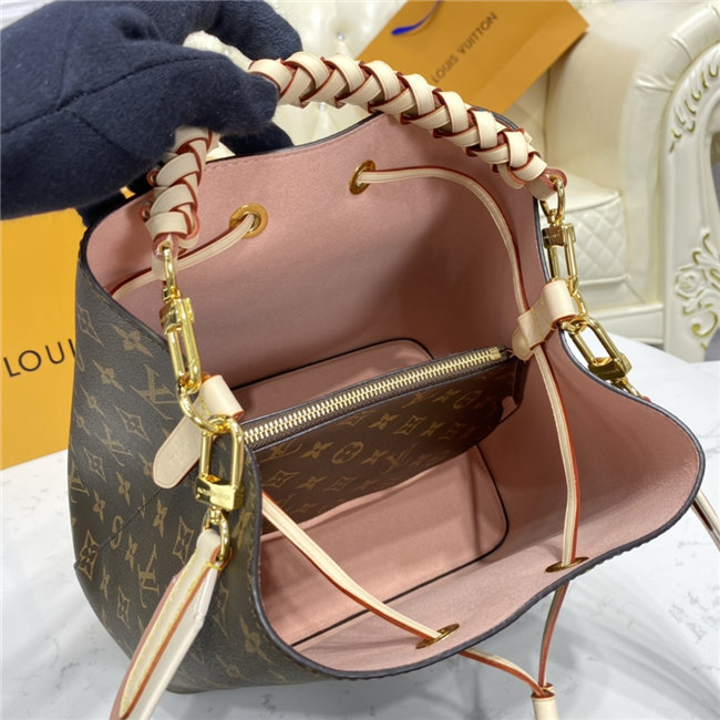 The NéoNoé MM bucket bag in Monogram canvas with the new braided leather top handle is a testament to Louis Vuitton’s leather craft prowess. The exquisite hand-painted edge dyeing gives the braiding more contrast and texture for a truly precious feel. The peach-color lining and cream-and-peach shoulder strap refresh the design.