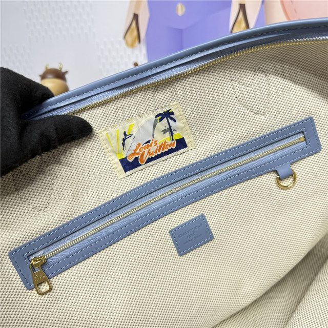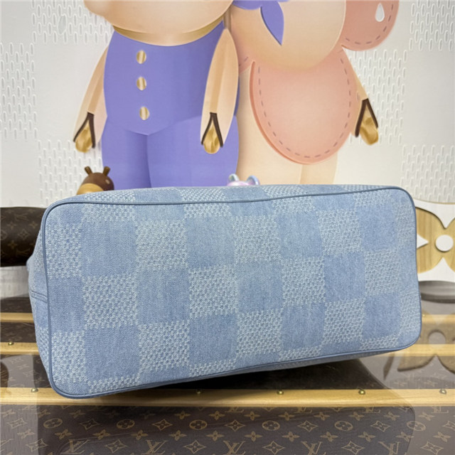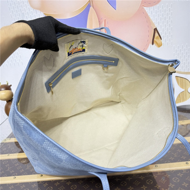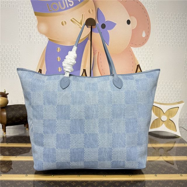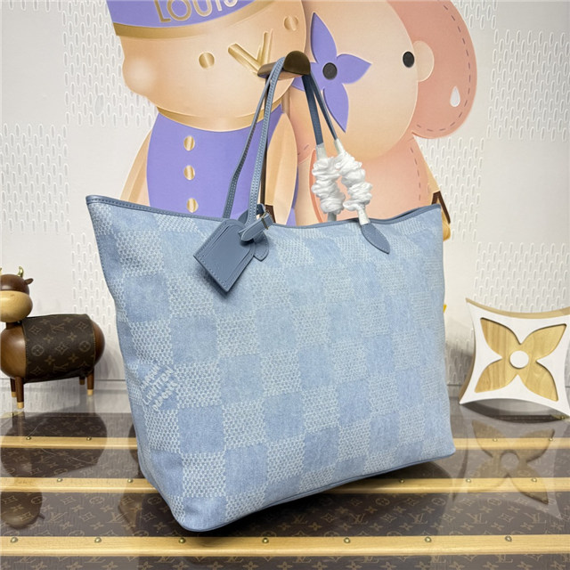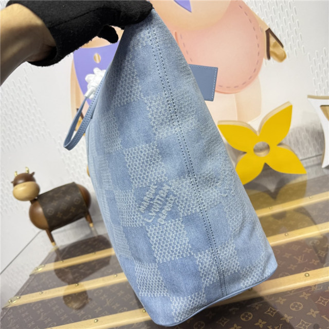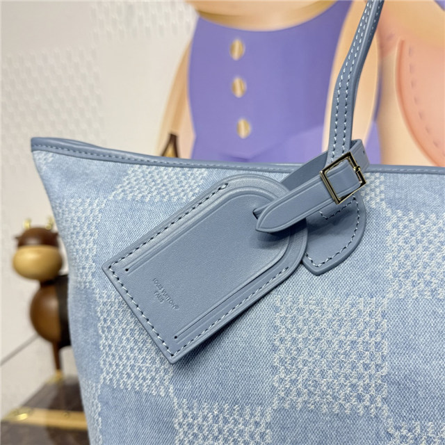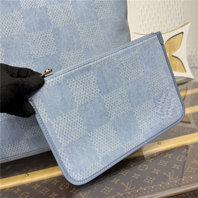 The ultra-roomy Nevereverfull tote is fashioned from Damier Denim 3D cotton canvas, featuring a distinctive checkerboard pattern. Finished with polished gold-toned hardware and denim-blue leather trim, this Nevereverfull exudes casually masculine sophistication. The zipped closure and removable pouch in denim cotton canvas ensure belongings stay secure.