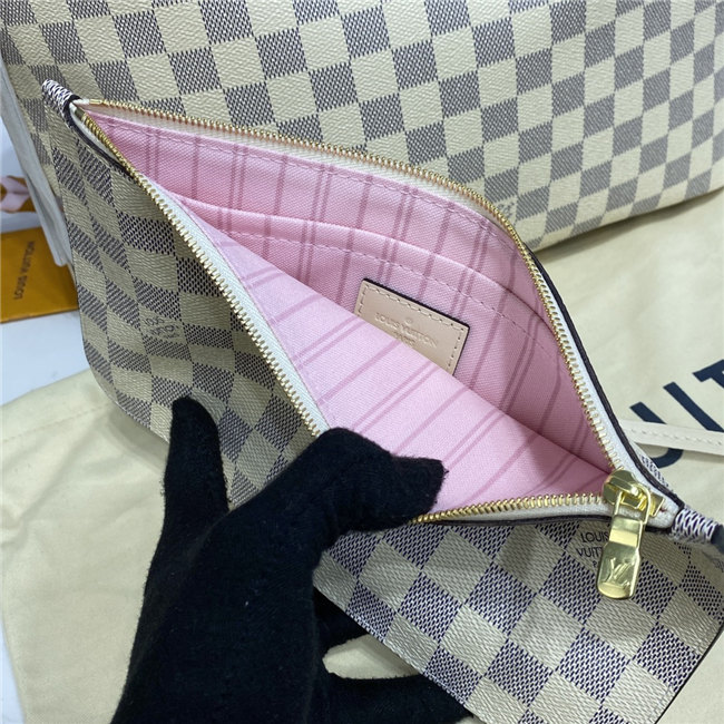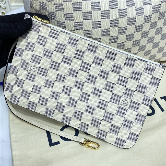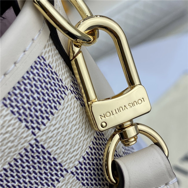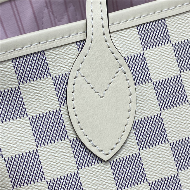 This Neverfull MM tote is fashioned from Damier Azur canvas with a strap in two tones of hand-braided leather. Inside, there”s a removable pouch in matching checkerboard canvas. The bag”s side laces can be cinched to keep what”s inside safe and sound. Slim handles slip easily over the shoulder or arm.