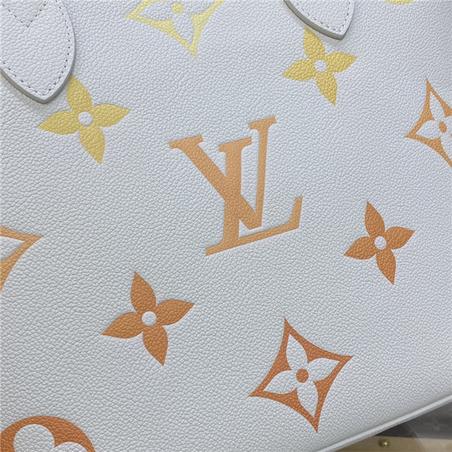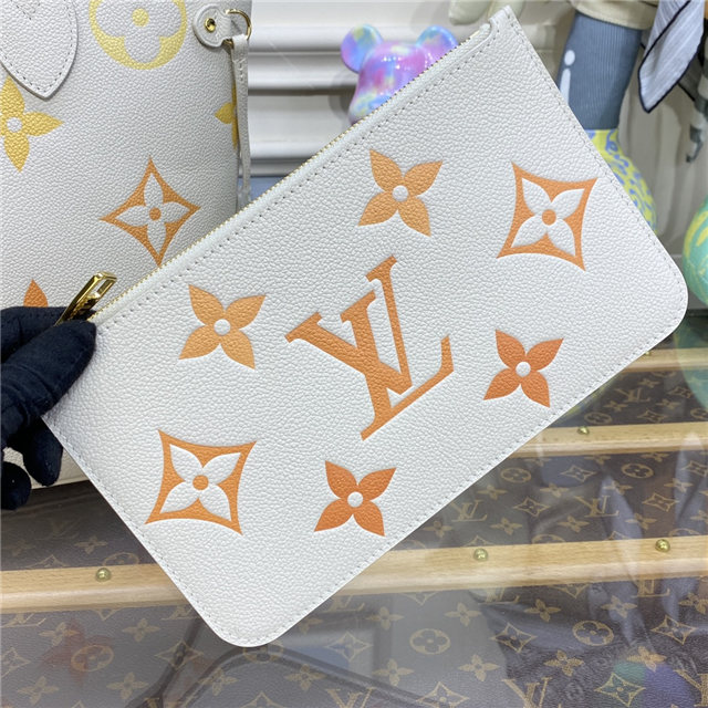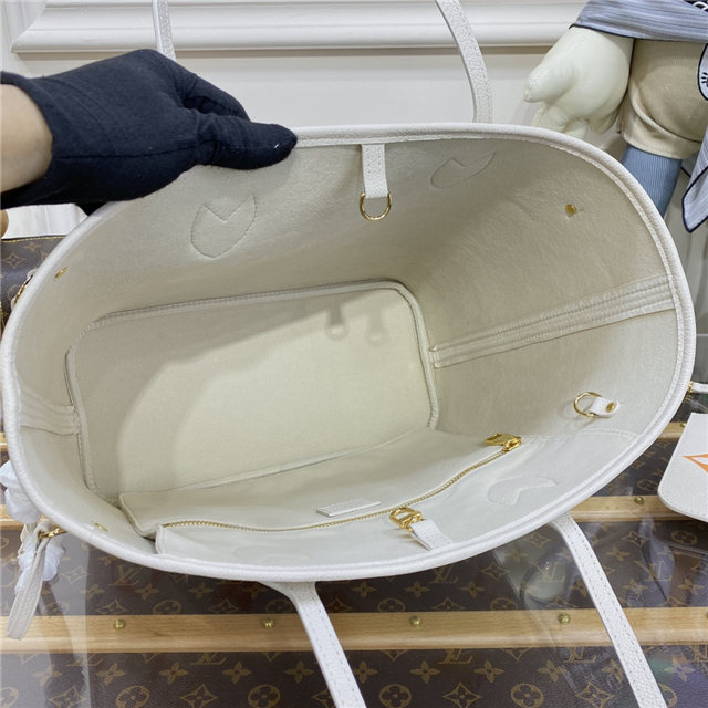 The Neverfull MM tote takes on a tastefully feminine feel in Monogram Empreinte leather, with a gradient treatment of oversized LVs and Monogram Flowers. This functional carryall can be cinched closed with its side laces or left open for a more casual look. Inside, there’s a removable zipped pouch in latching Monogram Empreinte leather will fit valuables.