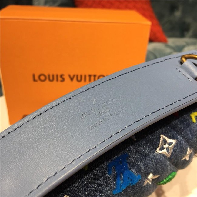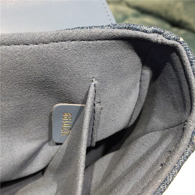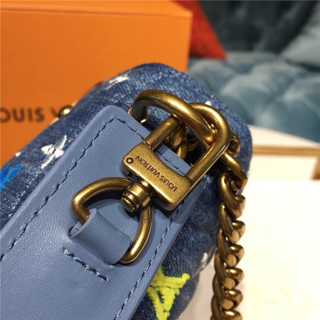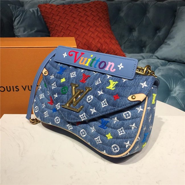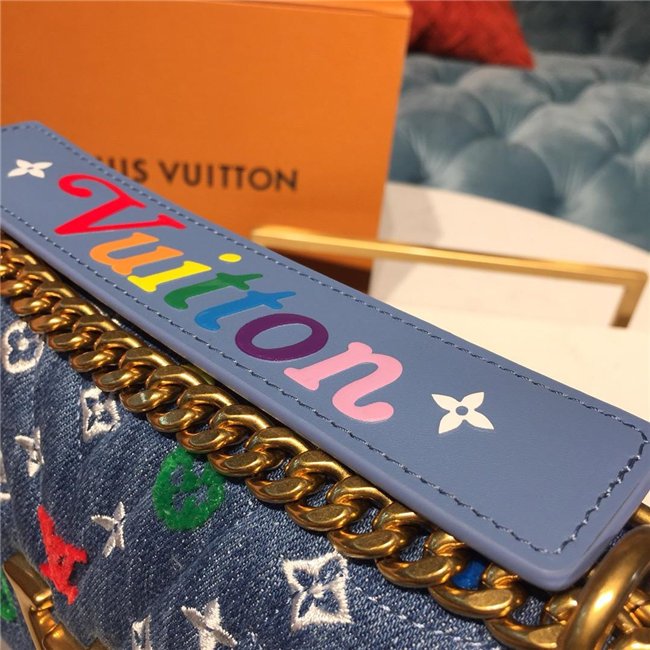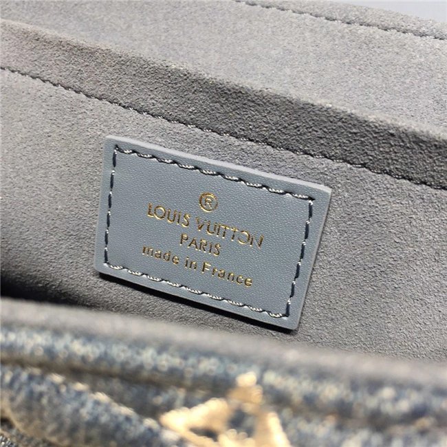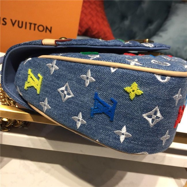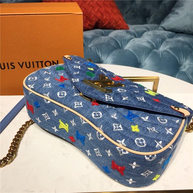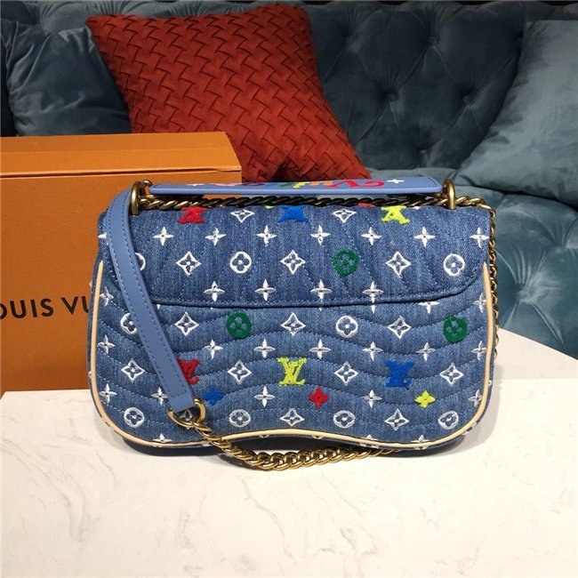 For Spring-Summer 2019, the New Wave Chain Bag MM comes in quilted denim with embroidered Monogram Flowers and bright tufted “LV”s and Monogram blossoms. The gold-color LV on the front complements the removable handle with the embroidered multicolor “Vuitton” signature. The classic gold-color chain shoulder strap completes the picture.