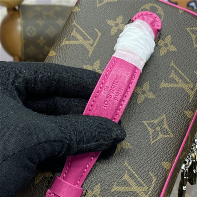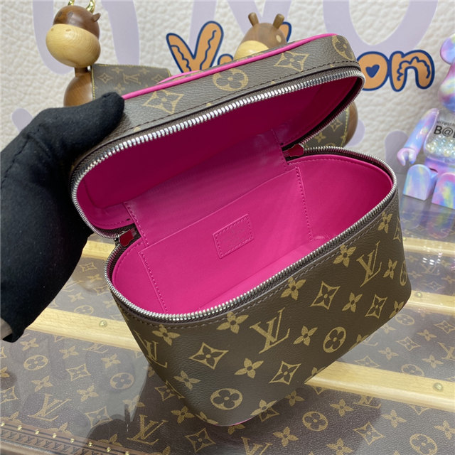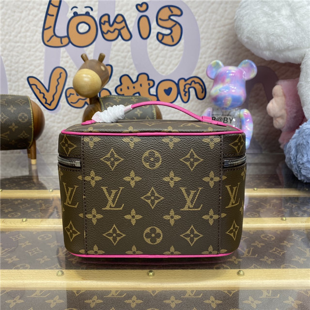 Fashioned from Monogram Macassar canvas, the Nice Mini toiletry bag is livened up with a dash of color on the leather top handle and leather piping. The interior features a washable textile lining in the same colorway as the top handle and piping. This supple case fits easily into a travel bag or suitcase.