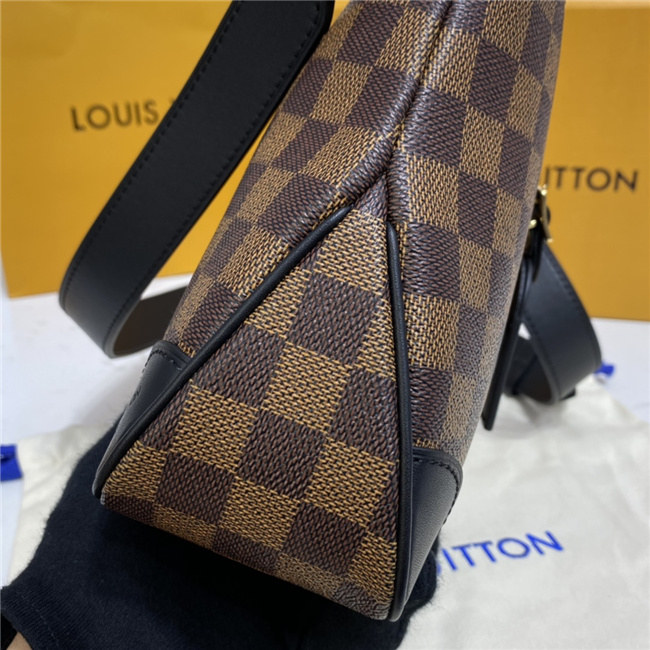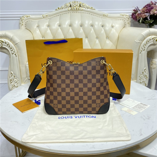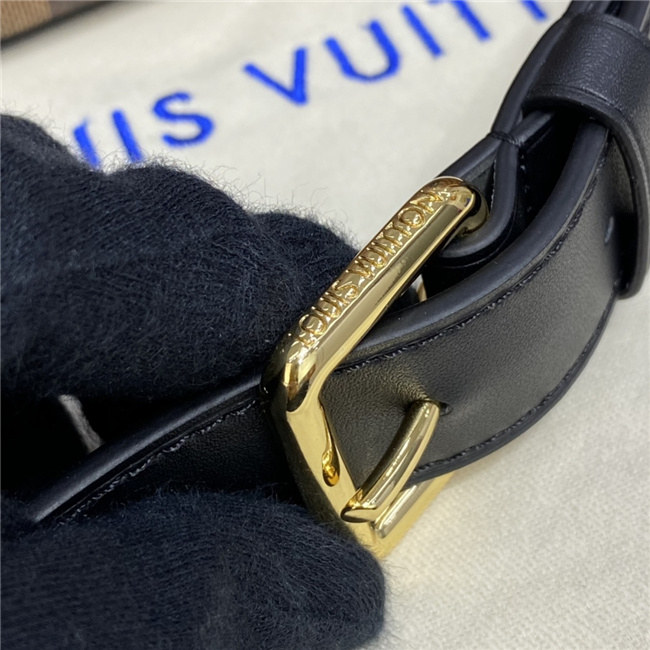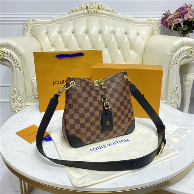 The body-friendly Odéon PM is a zipped satchel bag, featuring heritage House details like a leather name tag and leather corners. It has a sporty vintage vibe thanks to the Damier Ebene canvas and black leather trim. A wide, adjustable, removable strap allows shoulder, cross-body or clutch carry.