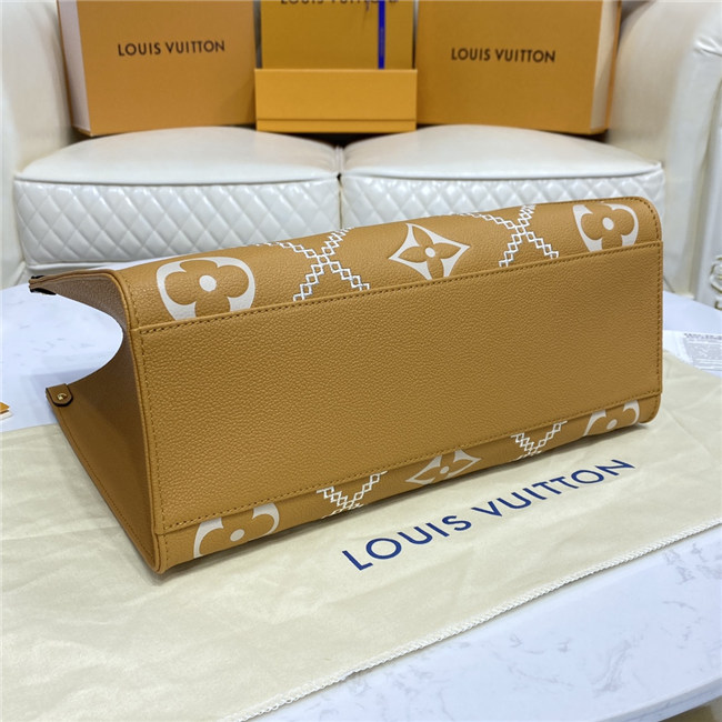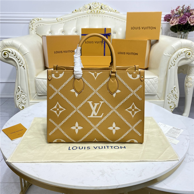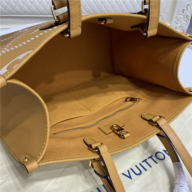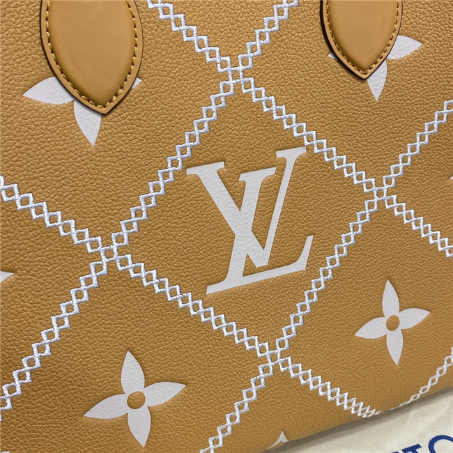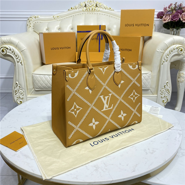 This Onthego MM tote features a stitched motif that echoes the quilted interior of Louis Vuitton’s original trunks. The Monogram Empreinte leather is first printed, then embossed and embroidered with the pattern, to create a rich, crafted effect. A statement piece of the season, the bag is a versatile companion that lends itself to a variety of carry styles.