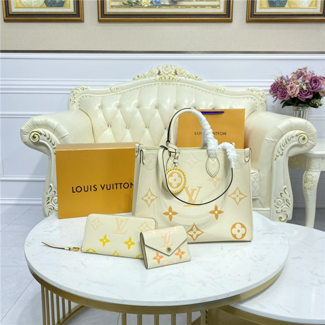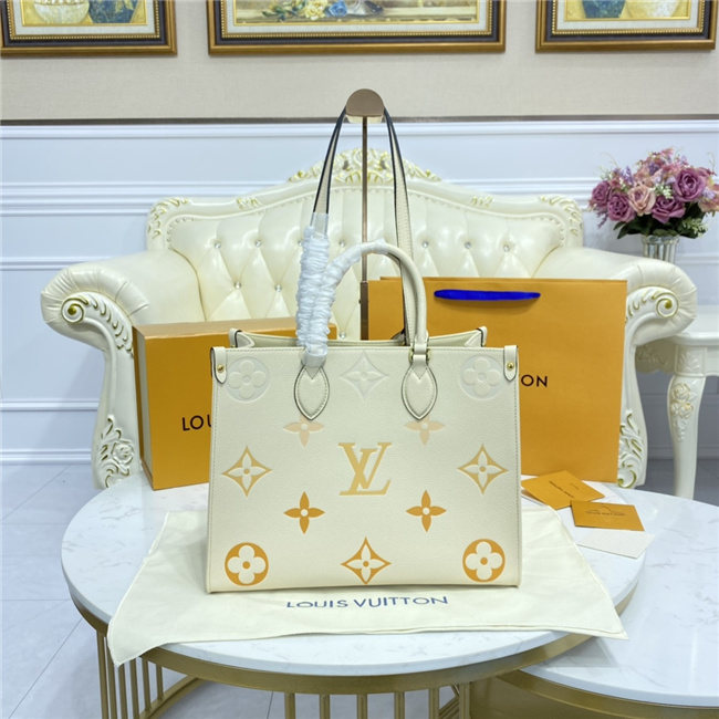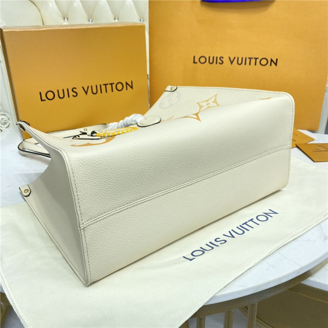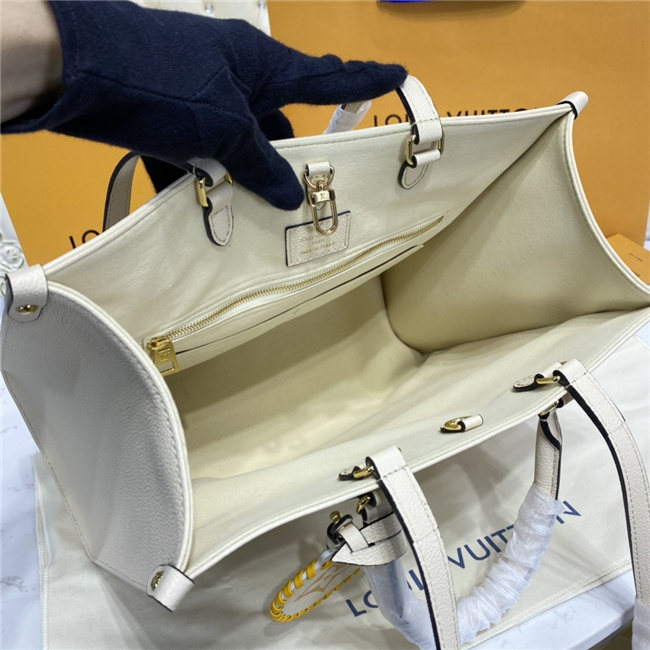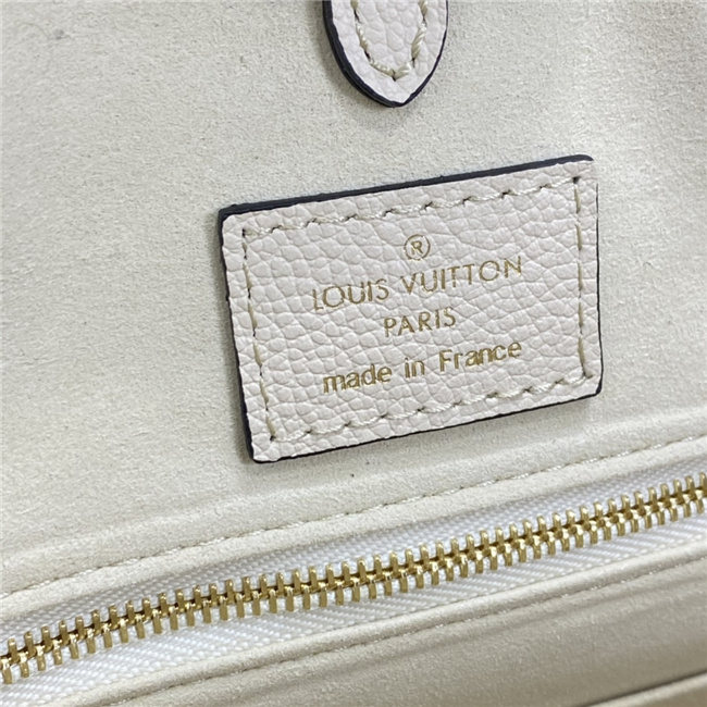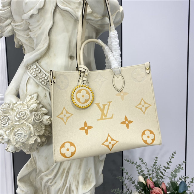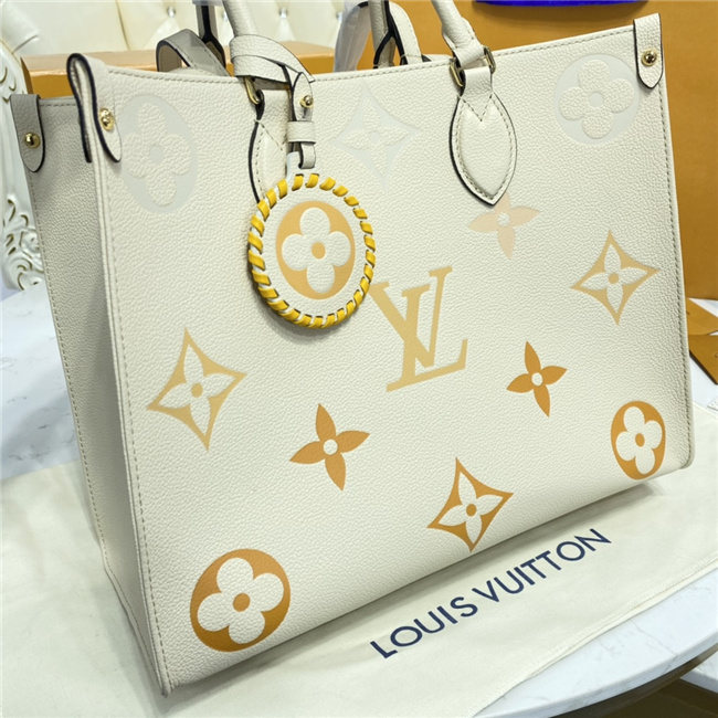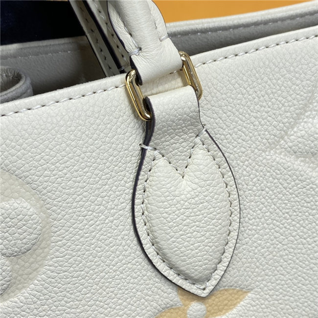 Made from a Monogram Empreinte leather with a subtle color gradient on the embossed Monogram pattern, the emblematic OnTheGo MM tote bag is part of the By The Pool capsule collection. It has two sets of handles, long and short, for hand and shoulder carry, and a spacious interior, which easily fits essentials such as a laptop. A leather charm gives a playful spirit and highlights the LV craftsmanship.