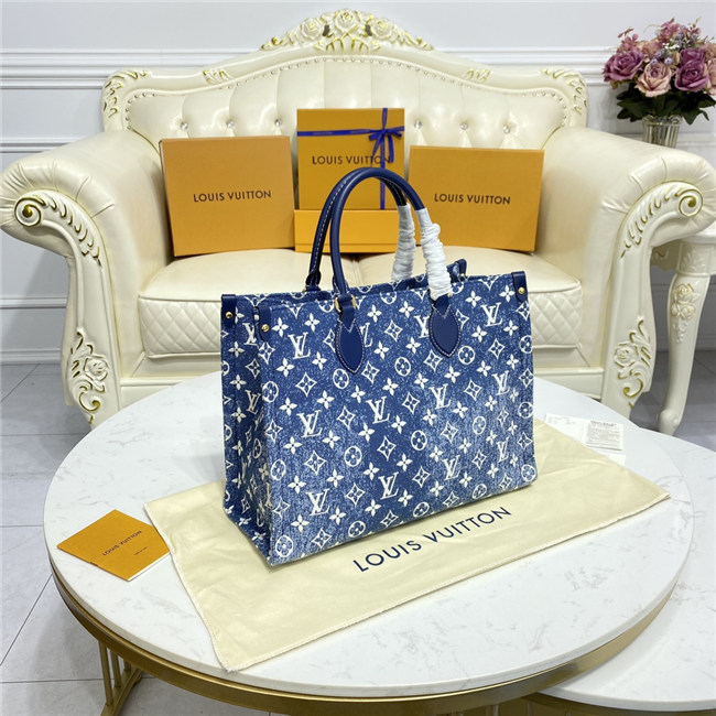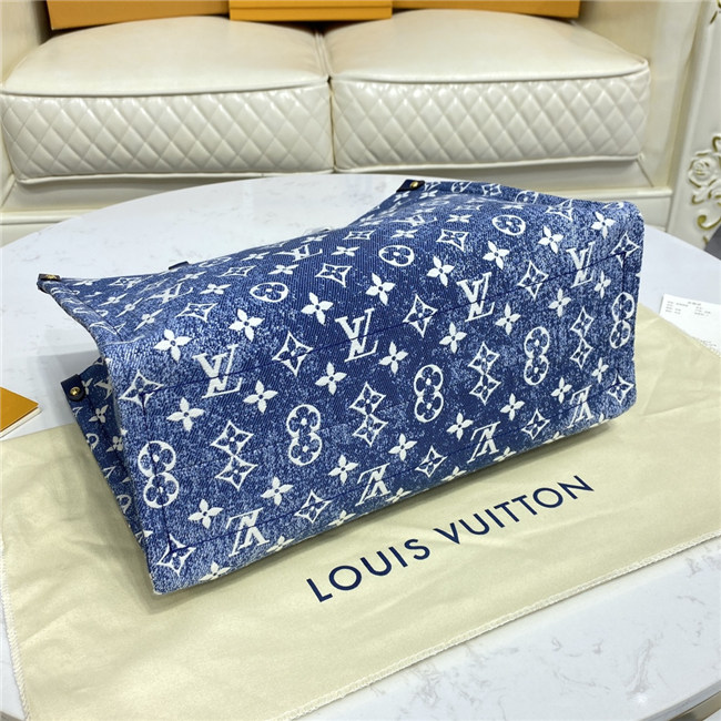 This Onthego MM tote looks fresh and fashionable this season, dressed in Monogram denim jacquard. The finely crafted textile is finished with a distinctive stone-washed effect, set off by tone-on-tone navy leather trim and contrasted white stitching. Its generous dimensions make this carryall ideal for work or weekend, carried either by its articulated top handles or long shoulder straps.