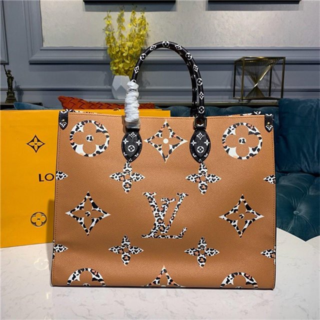 The Onthego tote bag takes on a bold new look in coated canvas with a print combining multiple sizes of the Monogram motif with leopard and zebra skin patterns. Its generous capacity, removable shoulder straps, and top handles make the Onthego perfect for everyday use.