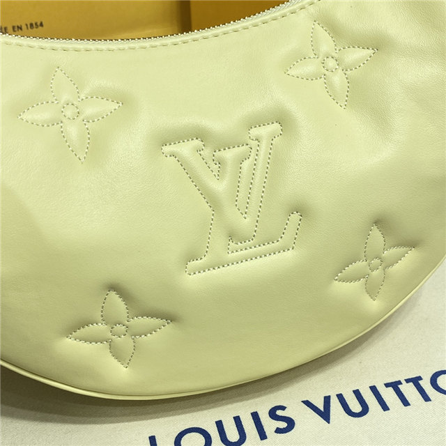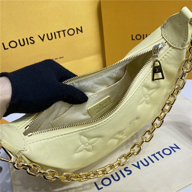 The Over The Moon delights with its versatile shape in quilted calf leather. The embroidered puffy Monogram pattern brings a statutory feel while the adjustable strap and gold-color chain deliver a myriad of carry options: elbow, short shoulder, cross-body, and long shoulder. With the strap removed, it can even be carried as an evening clutch.