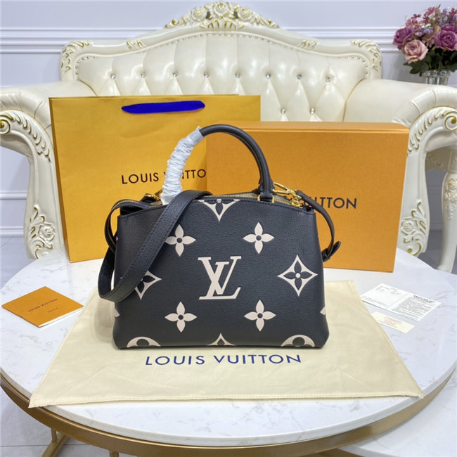 The perfect everyday companion, the smart and sophisticated Petit Palais handbag is fashioned from grained leather with an oversized pattern of Monogram Flowers and LVs printed and embossed on it. The gold-color padlock and leather name tag bring to mind the House’s legacy of fine luggage. A detachable strap can be adjusted for comfortable shoulder and cross-body wear.