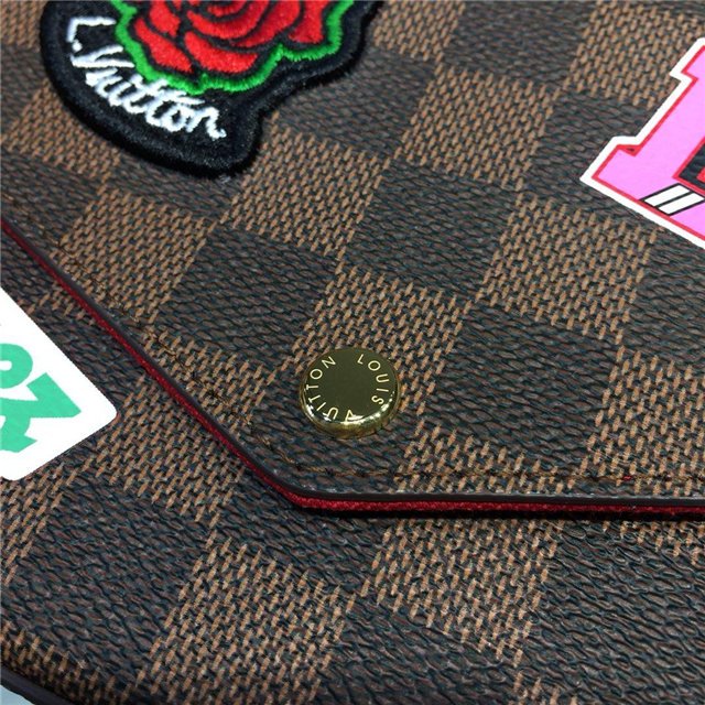 Decorated with embroidered and printed patches depicting iconic House symbols, the Pochette Felicie is a nod to the Louis Vuittons historic trunks with their exotic travel stickers. This versatile wallet can be transformed into a stylish shoulder bag thanks to its removable golden chain, or carried as a clutch.