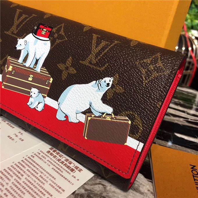 This envelope style Sarah wallet combines an exterior in Monogram canvas with an ingeniously designed interior featuring a variety of pockets and credit card slots. The adorable polar bears, playing with iconic Louis Vuitton trunks and luggage, transform this classic Sarah Wallet into a stylish object of whimsy.