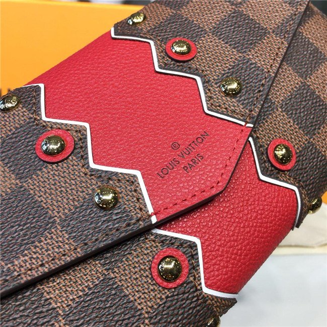 Louis Vuitton brings the graphic Karakoram pattern to the Sarah Wallet for Winter 2018. The serrated stripe in red leather with luminous white bands on each side and Louis Vuitton engraved gold-finish studs brings a strikingly graphic feel to this classic envelope-style wallet.