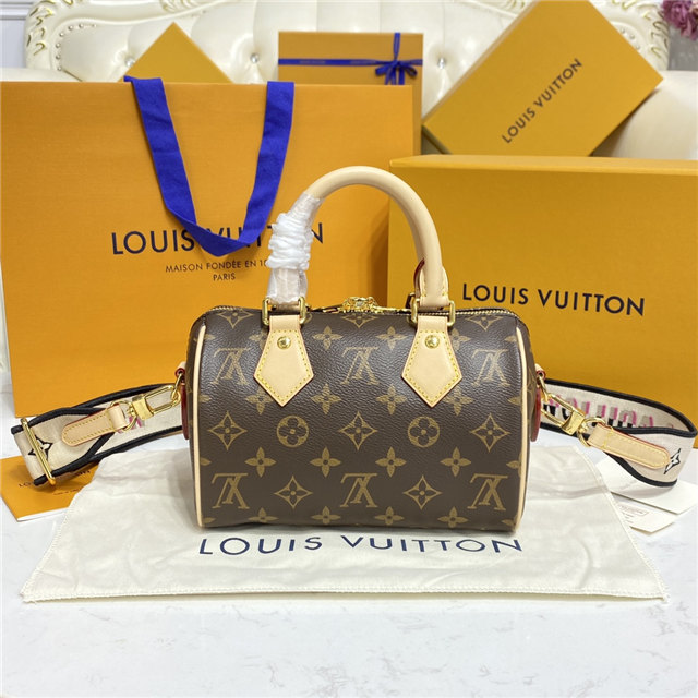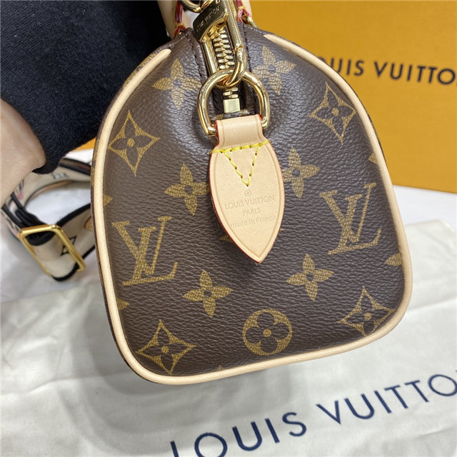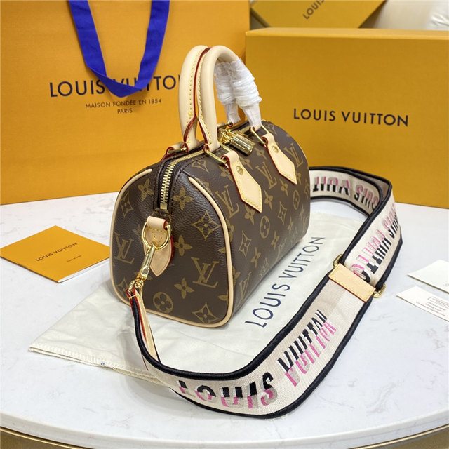 Like a diminutive version of the House’s historic Speedy travel bag, the Speedy Bandoulière 20 handbag is crafted from Monogram canvas with natural cowhide trim. In addition to the rolled leather top handles, there’s a wide detachable and adjustable textile strap with a woven Louis Vuitton signature. This bag’s classic design is completed with red textile lining.