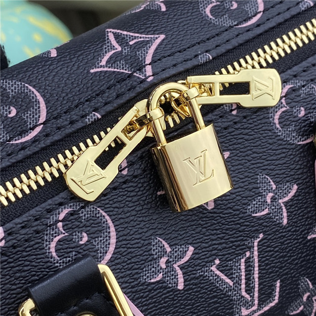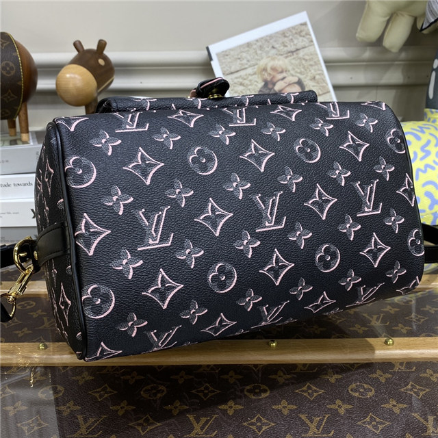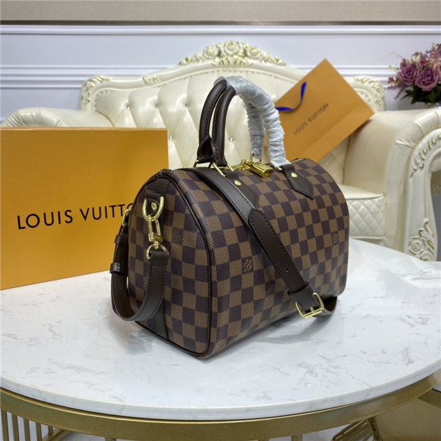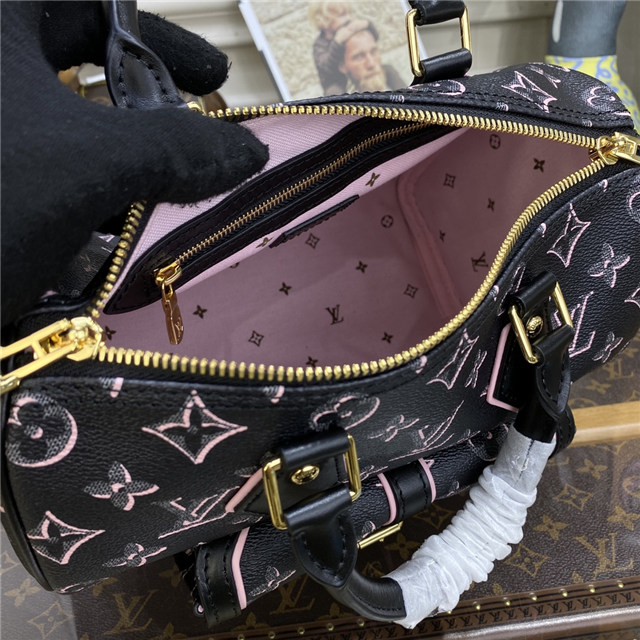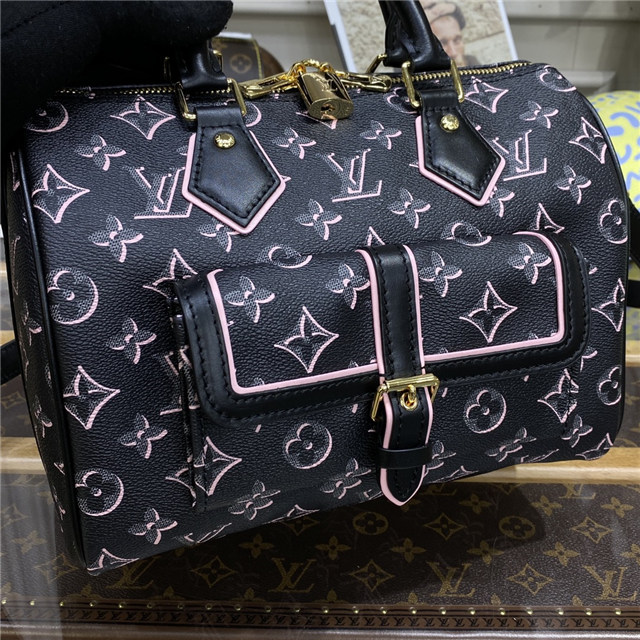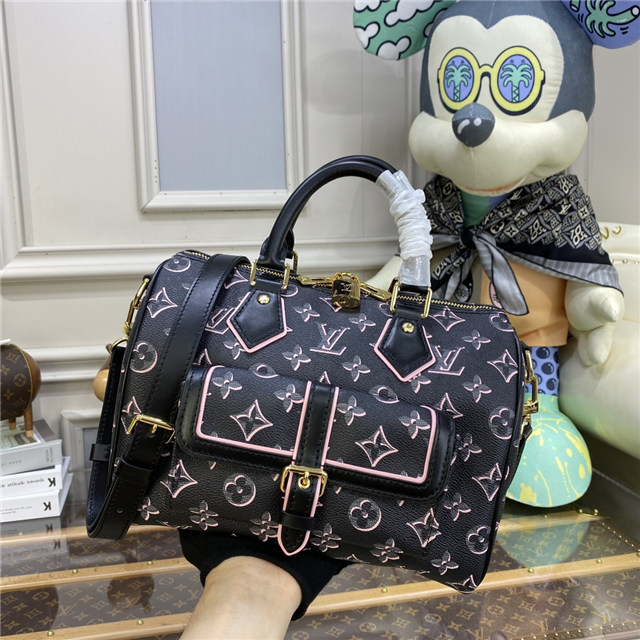 The compact Speedy Bandoulière 25 handbag reinvents its elegant silhouette with an outside pocket and gold-color buckle. The miniature Monogram pattern on the canvas and the leather trim evoke the House’s historic design codes, as do the rolled-leather handles and engraved padlock. An adjustable and removable strap enables shoulder and cross-body carry.