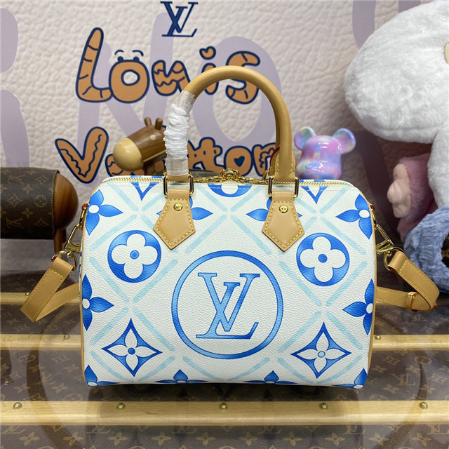Inspired by the House’s famed Speedy travel bag from the 1930s, the Speedy Bandoulière 25 handbag’s classic lines take on a summery feel in Monogram Tiles canvas. The pastel print on the bag and its lining evokes the ceramic tiles of Lisbon. The LV Circle signature is centered on the bag.