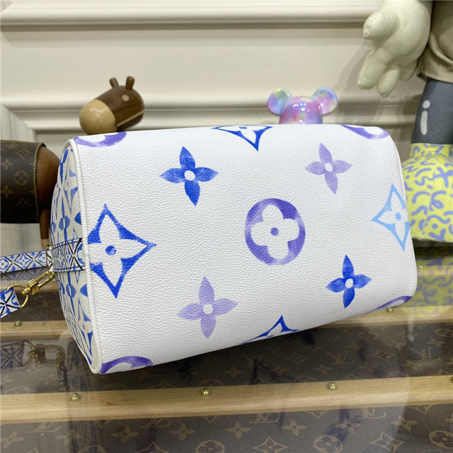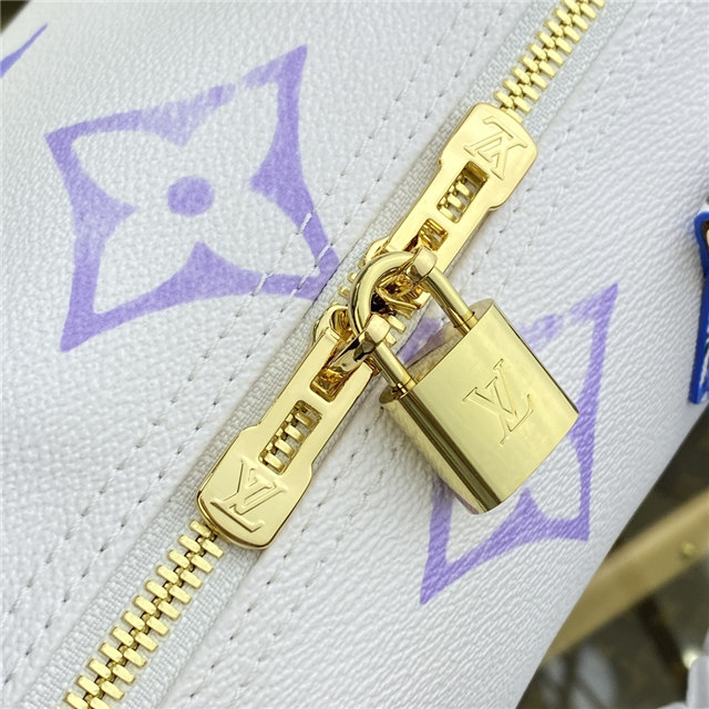 Crafted from coated canvas, the Speedy Bandoulière 25 handbag is adorned with a Giant Monogram pattern in nuances of pastel. The complex motifs on the trim, handles, handle mounts, and lining, in the same colorway as the rest of the bag, are inspired by the tiles at the House’s workshops in Asnières, just outside Paris.