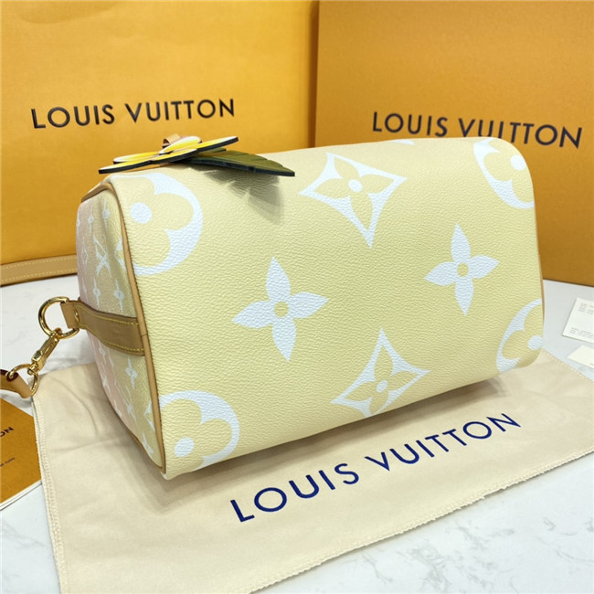 Fashioned from gradient pastel Monogram Giant canvas, the compact Speedy 25 is an elegant handbag, ideal for urban life. Introduced in 1930 as the “Express” and inspired by that era”s increasingly swift transportation options, today’s updated Speedy is accessorized with a leather flower charm.
