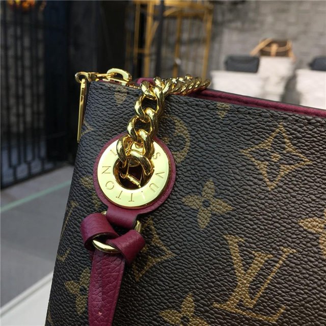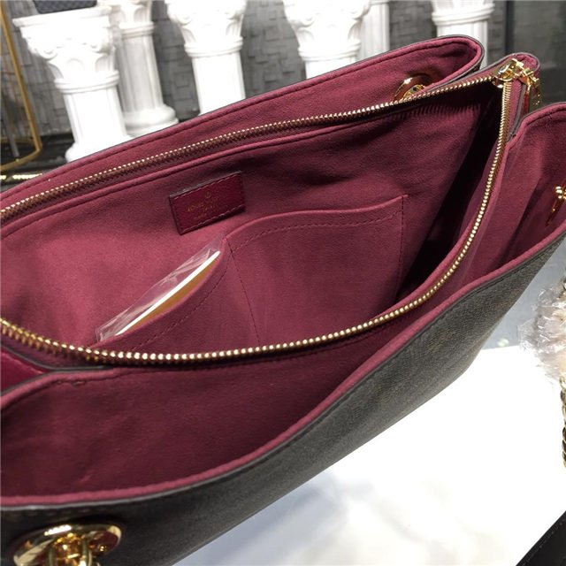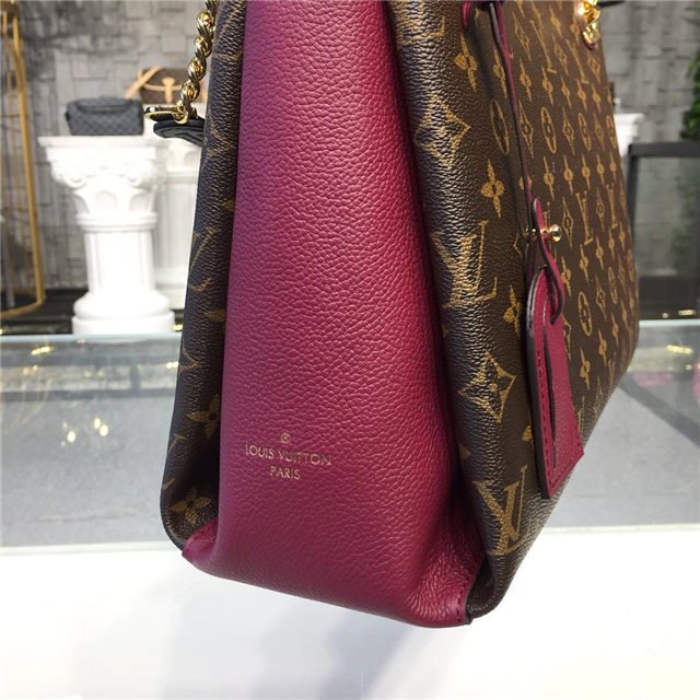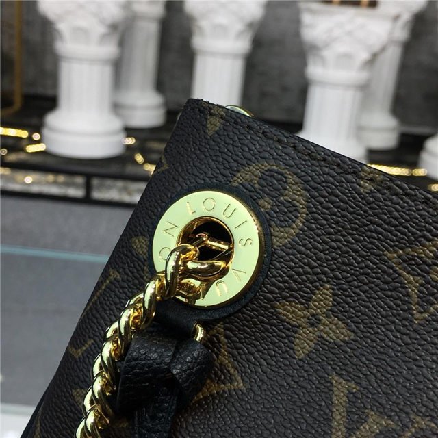This Surene MM handbag in Monogram canvas and grained calf leather, with colored-leather details on the sides and the name tag attached to the eyelet, is a functional and stylish chain bag. Big enough to fit A4 files and easy to wear thanks to the calf-leather shoulder pads on the two chains straps, the bag boasts a well-organized interior with three separate compartments.