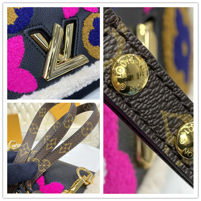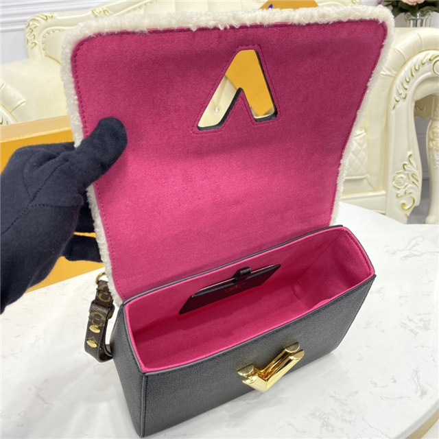 Crafted from grained leather, the Twist MM chain bag gets an aviator jacket inspired makeover with shearling along the edges of the bag’s flap. Shearling is also used to create the decorative Monogram Flowers and LV Initials in a giant Monogram pattern. The Monogram smart strap can be doubled for shoulder carry or lengthened for cross-body wear.