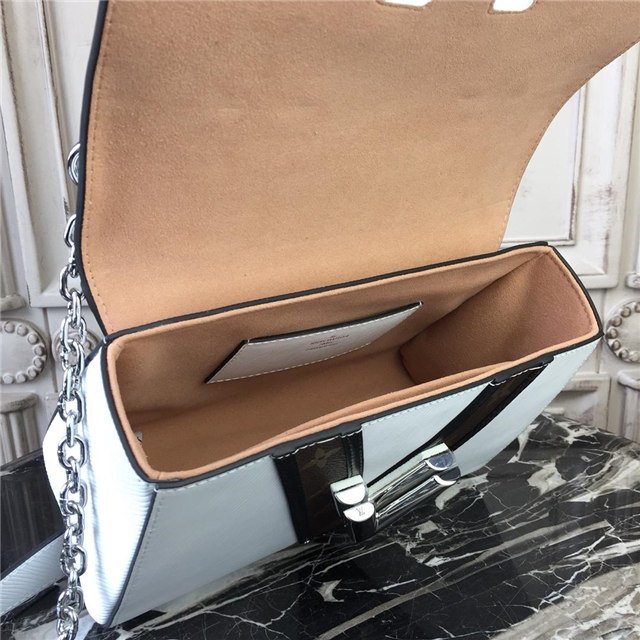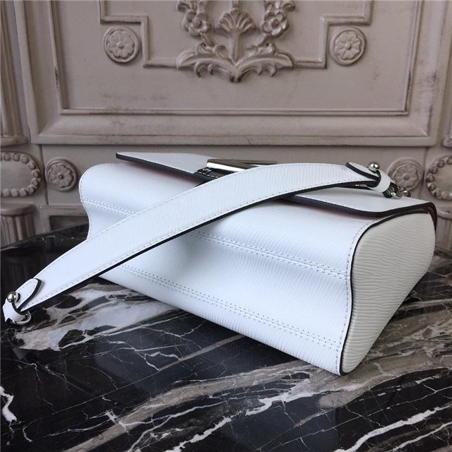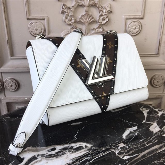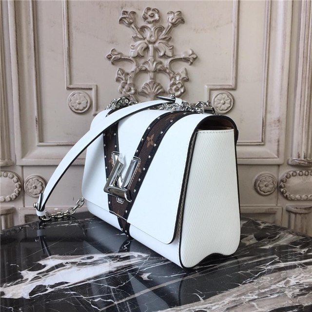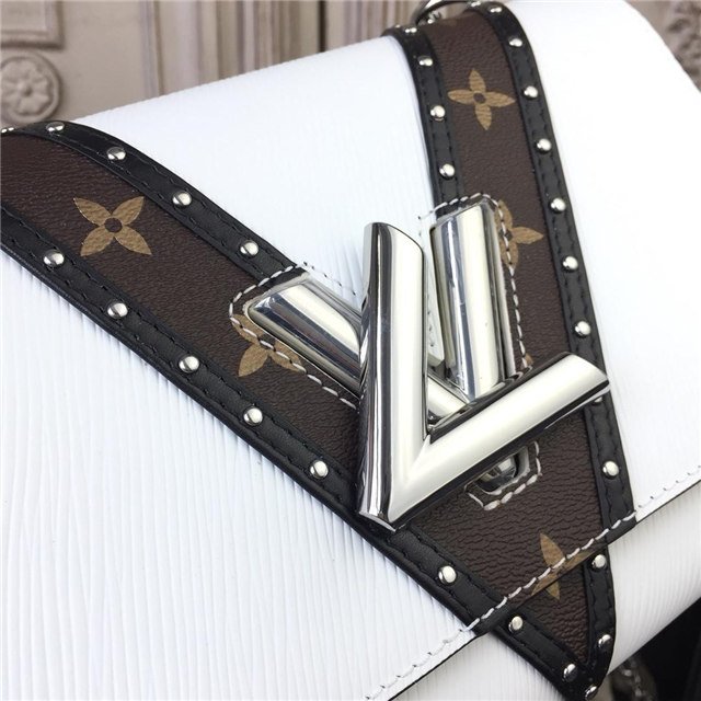 Mixing Iconic Epi leather with emblematic Monogram canvas and silver-color studs, this Twist MM handbag takes on a fashionable rock edge. Grained leather and coated canvas are stitched together to reproduce Vuitton”s emblematic V signature in a perfectly symmetric pattern that stretches from the bag”s flap to its body. This reimaging of one of the House”s New Classics is a testament to the House’s inimitable leatherworking expertise.