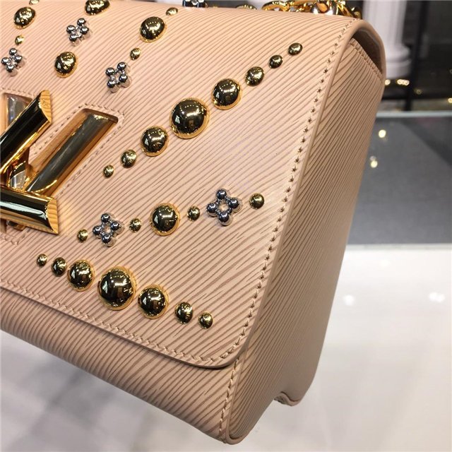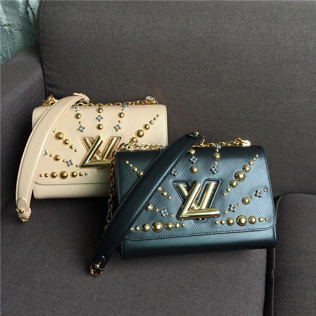 This refined Twist MM chain bag is embellished with a sunburst of engraved and flower shaped gold- and silver-tone studs, a nod to the colossal Sun sculpture that adorns the House flagship on Place Vend?me in Paris. Crafted from Epi leather, this precious piece is an ultimate touch of elegance for evening ensembles.