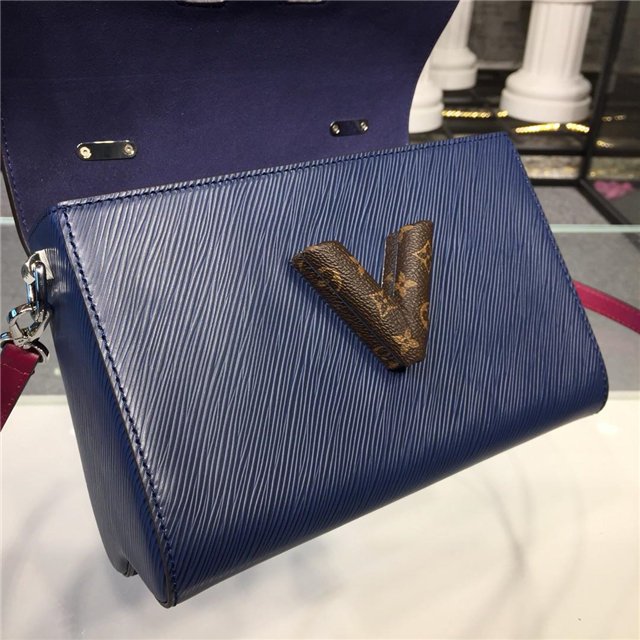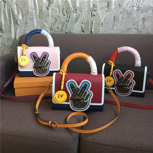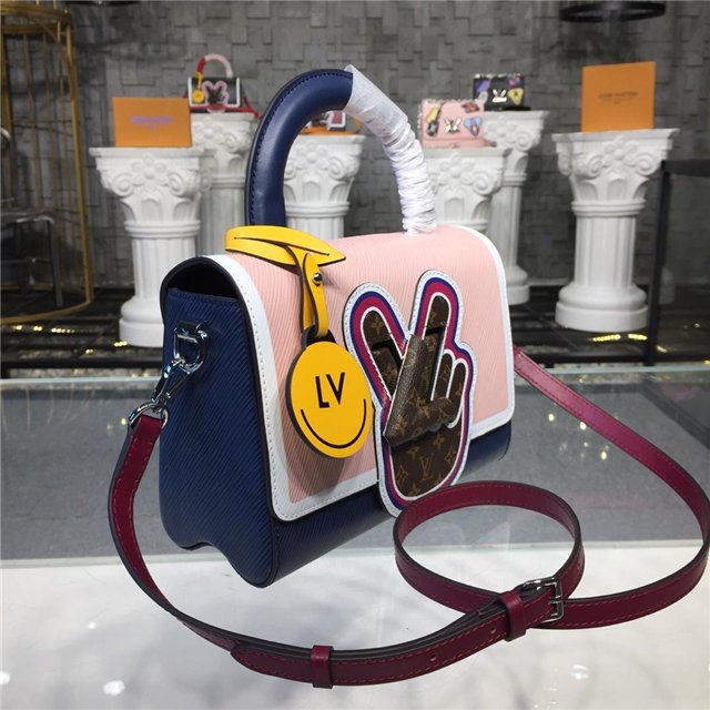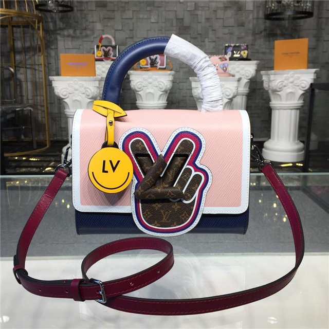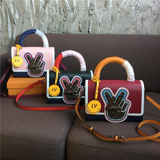 V for Vuitton morphs into a peace symbol on this Twist MM handbag. The motif is crafted from Mini Monogram canvas, which also covers the LV Twist lock, for a fun, trompe-l’oeil effect against the colorful Epi leather. The satchel handle, a nod to “back to school” days, is accented with a leather LV charm.