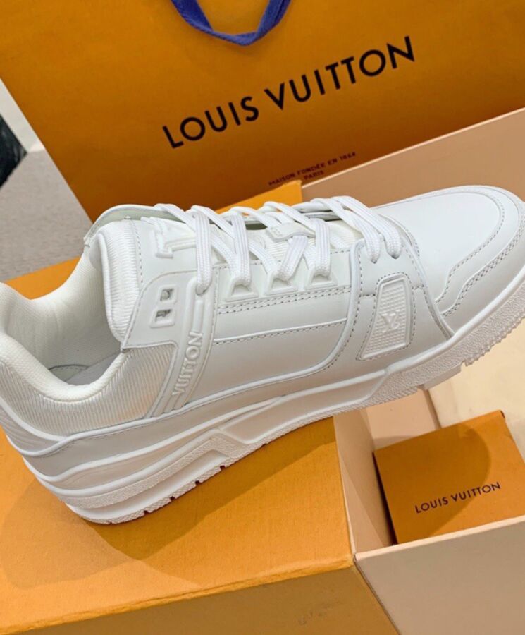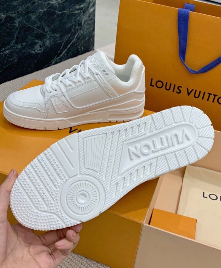 Crafted from supple white calf leather, this version of the LV Trainers is part of the season’s Rainbow Ready-to-Wear capsule collection. This cult model was designed by Louis Vuitton Artistic Director Virgil Abloh and inspired by vintage basketball trainers. Its elaborately constructed upper, which features rubber LV and Vuitton signatures, takes seven hours to stitch.