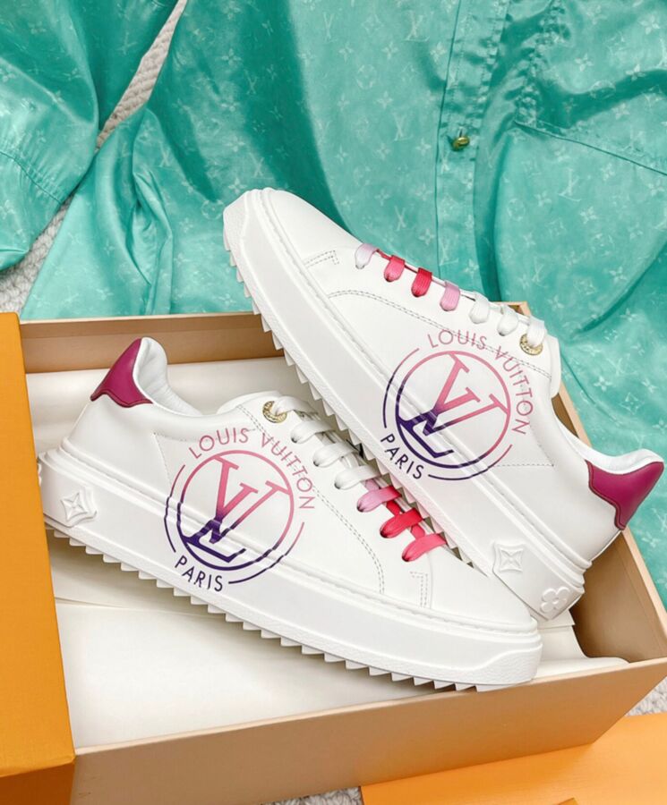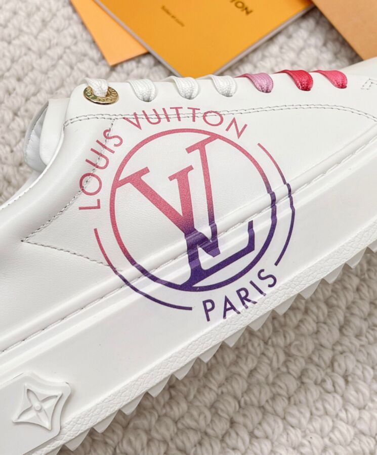 The emblematic Time Out sneaker is revisited in printed calf leather with a color-gradient effect on both the laces and the oversized LV Circle signature on the side. Other refined details of this design include Louis Vuitton-engraved, gold-tone eyelets and the 3-D pattern of Monogram Flowers on the distinctive elevated outsole.
