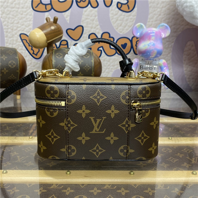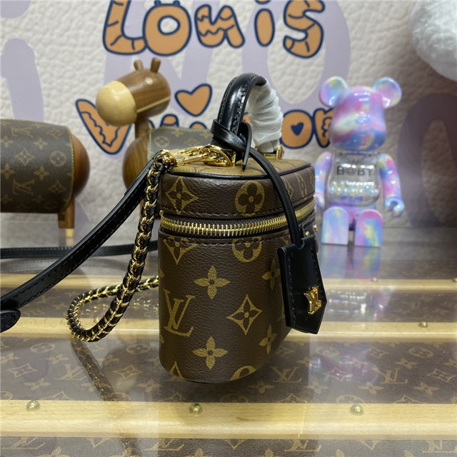 Inspired by heritage vanity cases, the Vanity Chain Pouch in Monogram canvas embodies the spirit of travel. This sophisticated, slim-line bag is complemented by leather trim on its top handle and removable, braided chain. It is notable for its rich signature details, including an LV-engraved padlock and a leather key bell.
