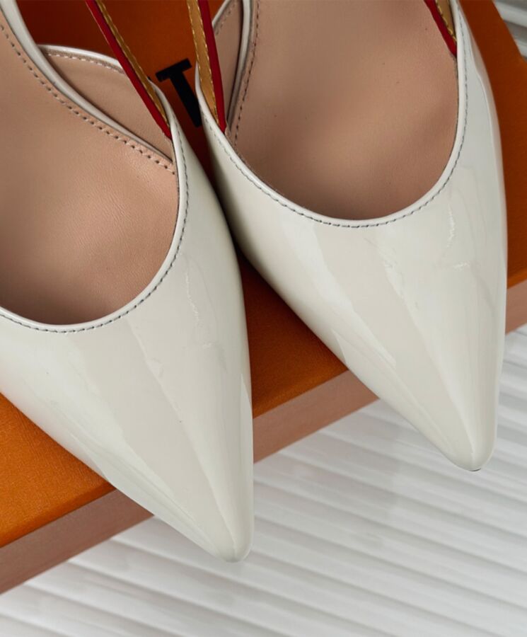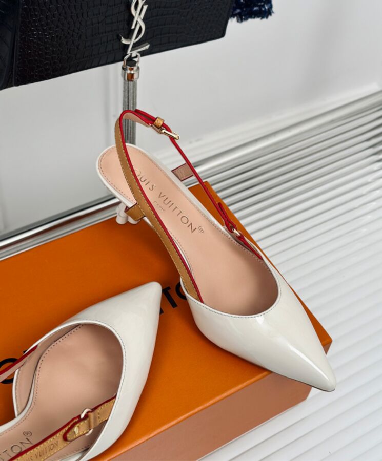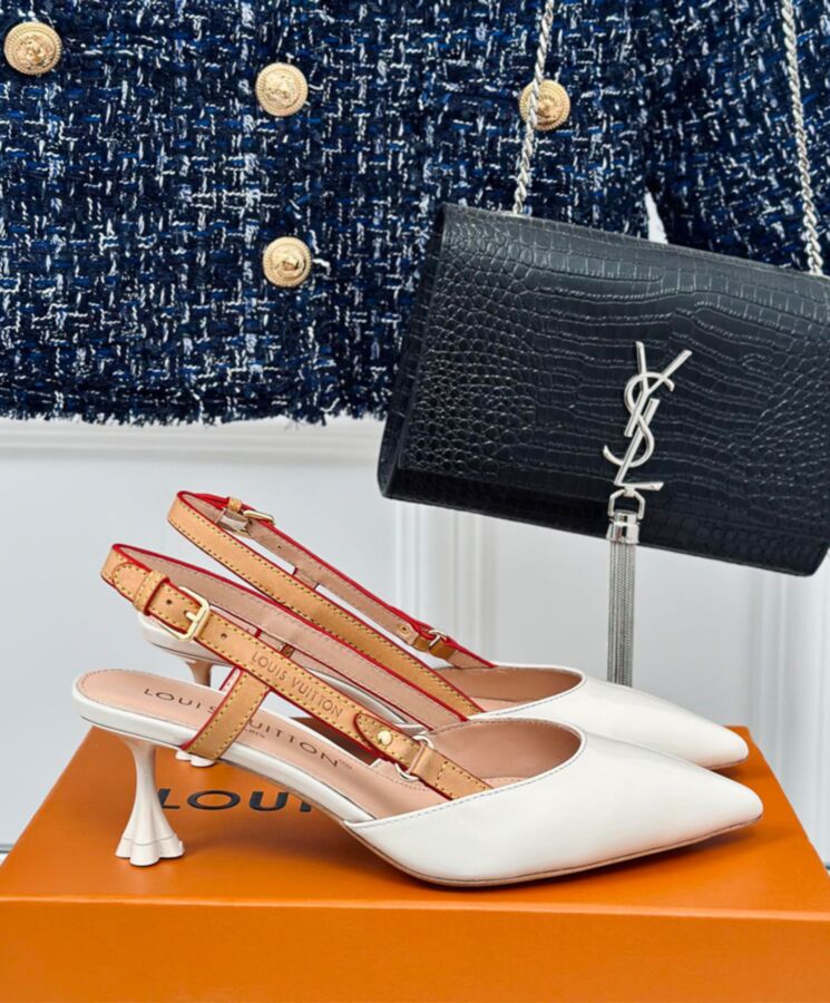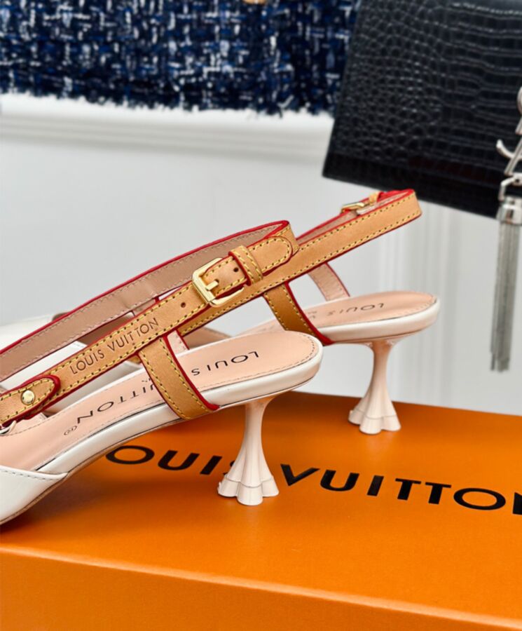 The Blossom slingback pump contrasts an upper in high-shine patent calf leather with a natural leather strap bearing the Louis Vuitton signature. This model is notable for its graceful heel in the shape of a round Monogram Flower. The back strap is embellished with an engraved, gold-tone stud and adjusted with a tiny buckle.