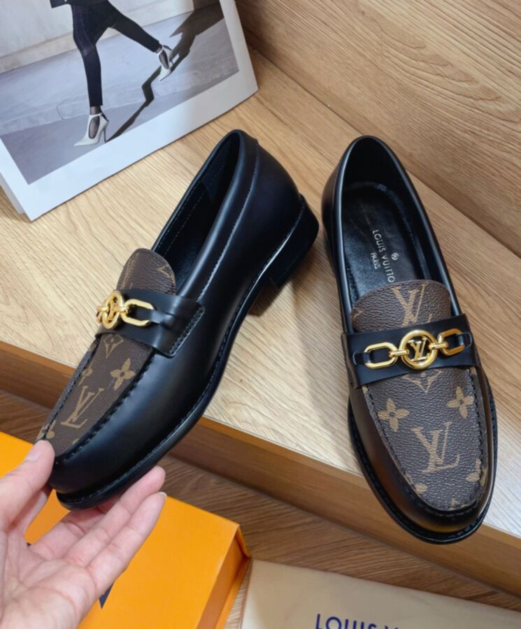 The Chess flat loafer combines glazed calf leather with Louis Vuittons iconic Monogram canvas to reinterpret the classic preppy loafer. The vamp is embellished with a gold-tone chain accessory featuring the LV Circle signature. This effortlessly stylish model is finished with a durable leather outsole.