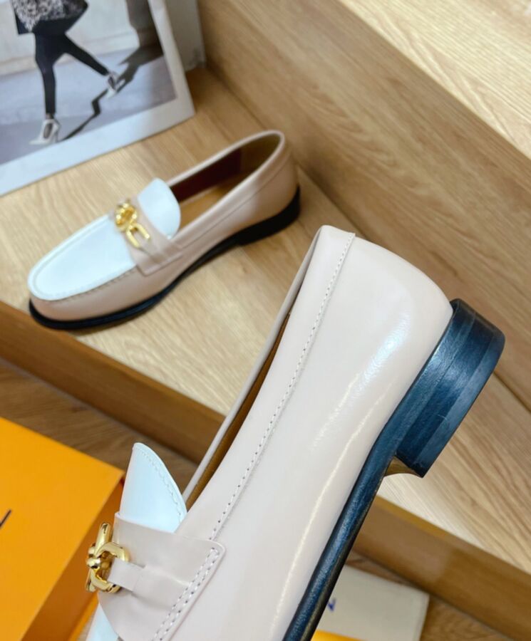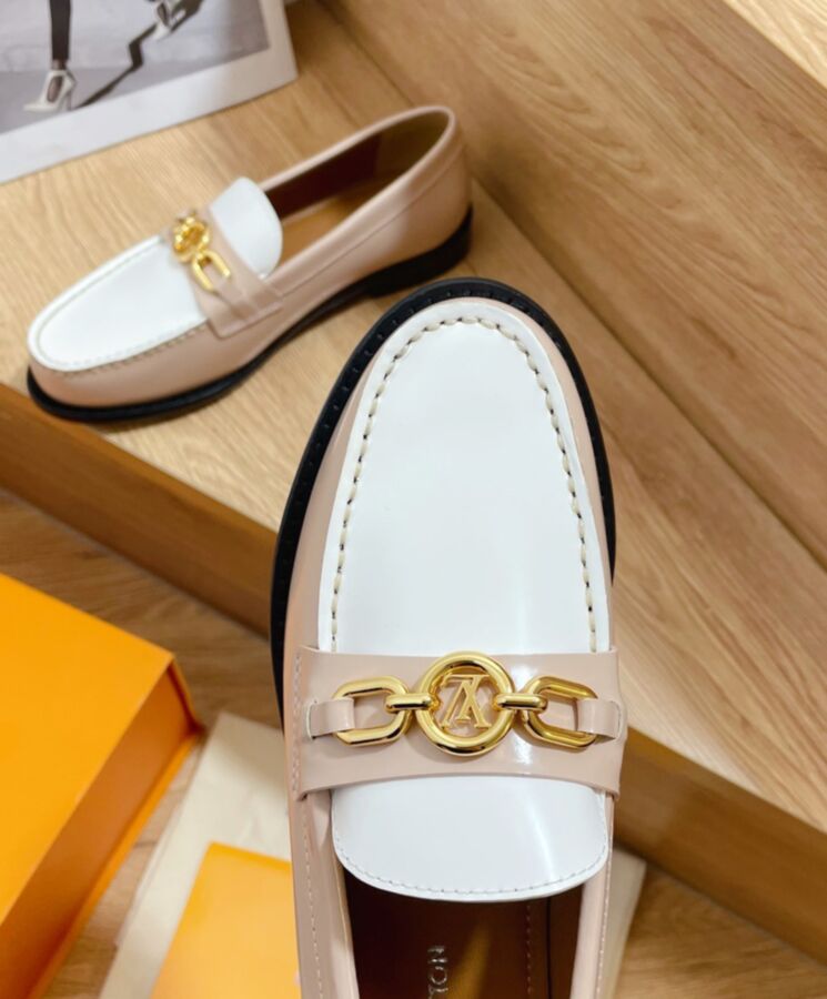 The Chess flat loafer is Louis Vuittons chic rework of the timeless preppy loafer. This version is crafted from glazed calf leather with a contrasting white vamp. A gold-tone chain accessory with the LV Circle signature embellishes this design, which combines classic style with all-day comfort.