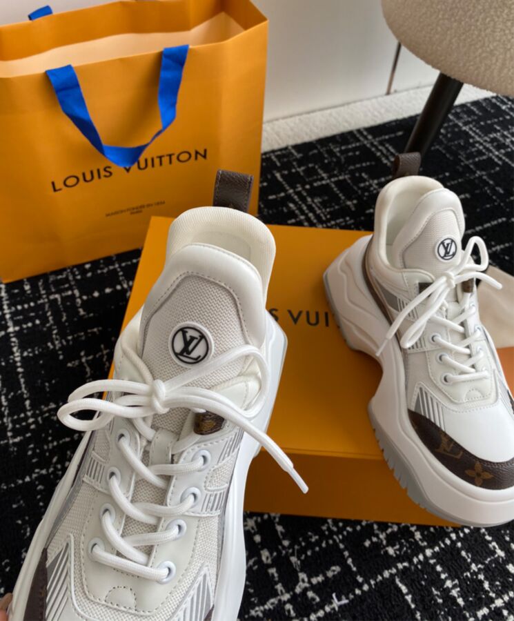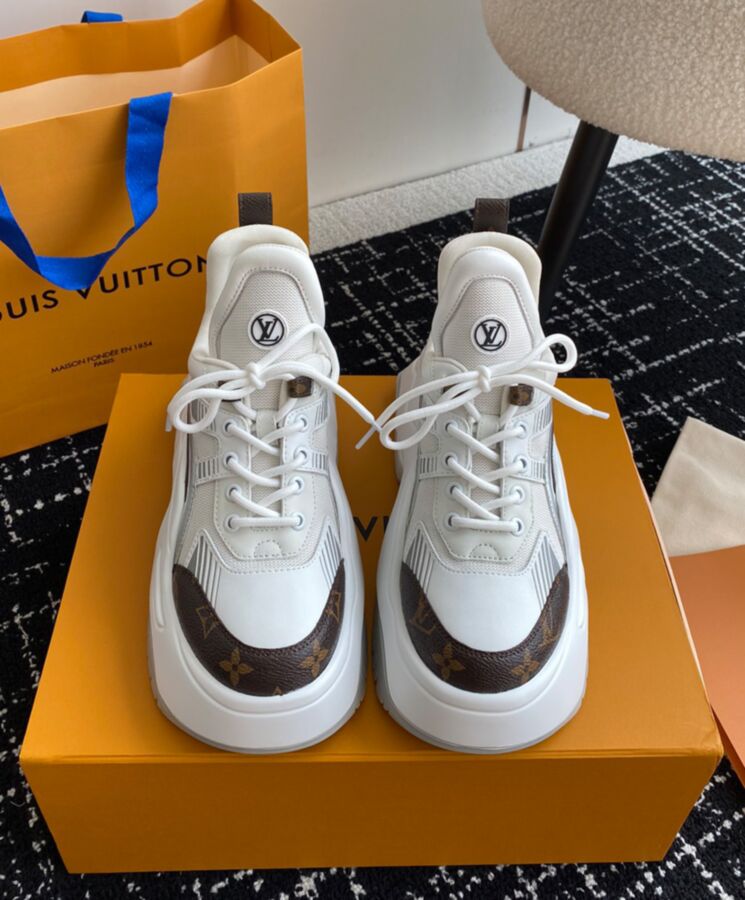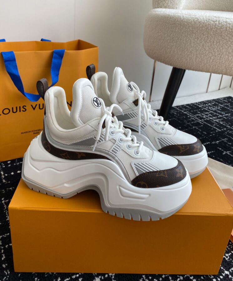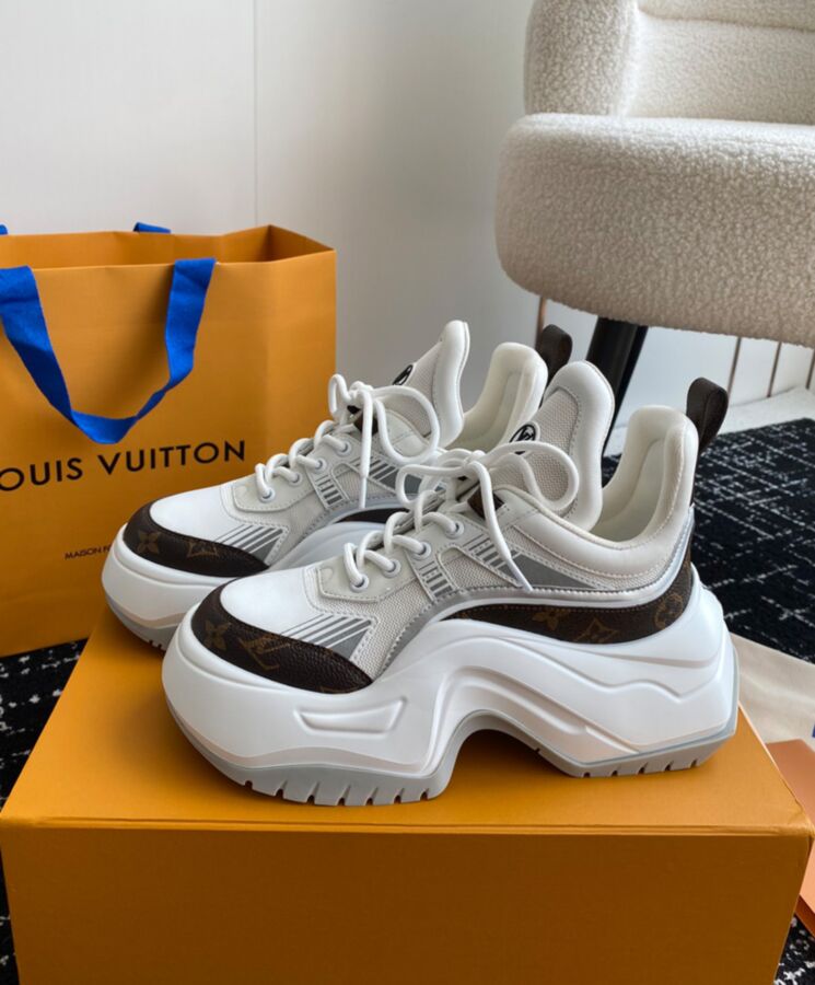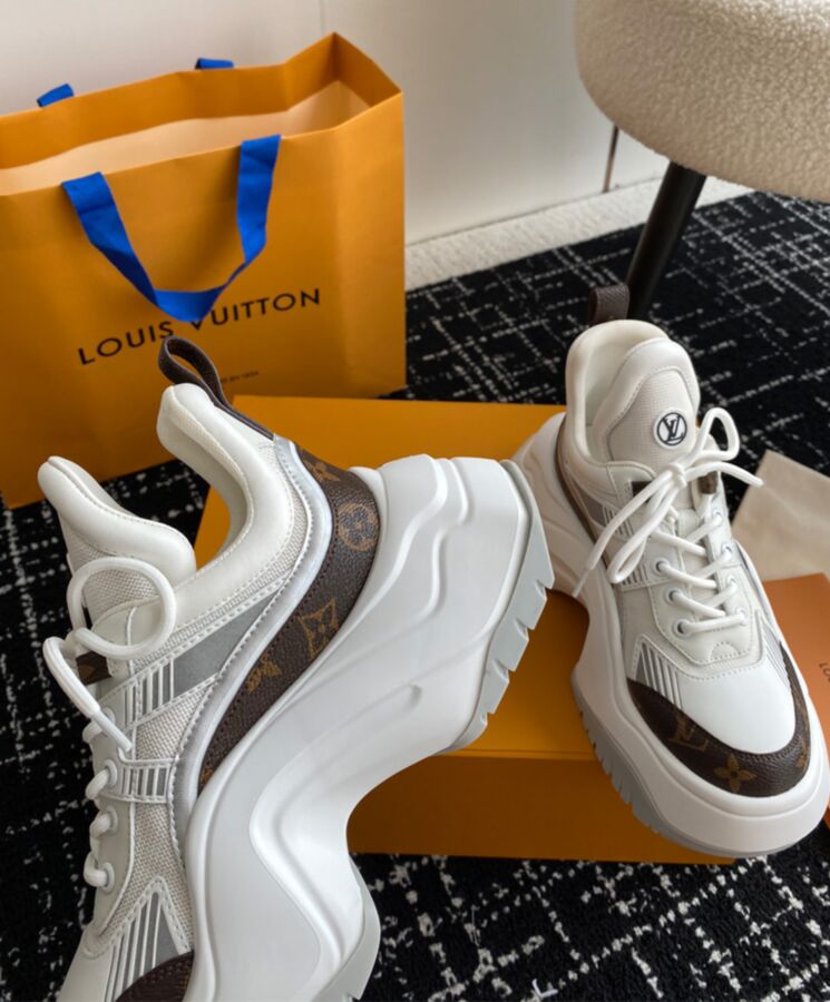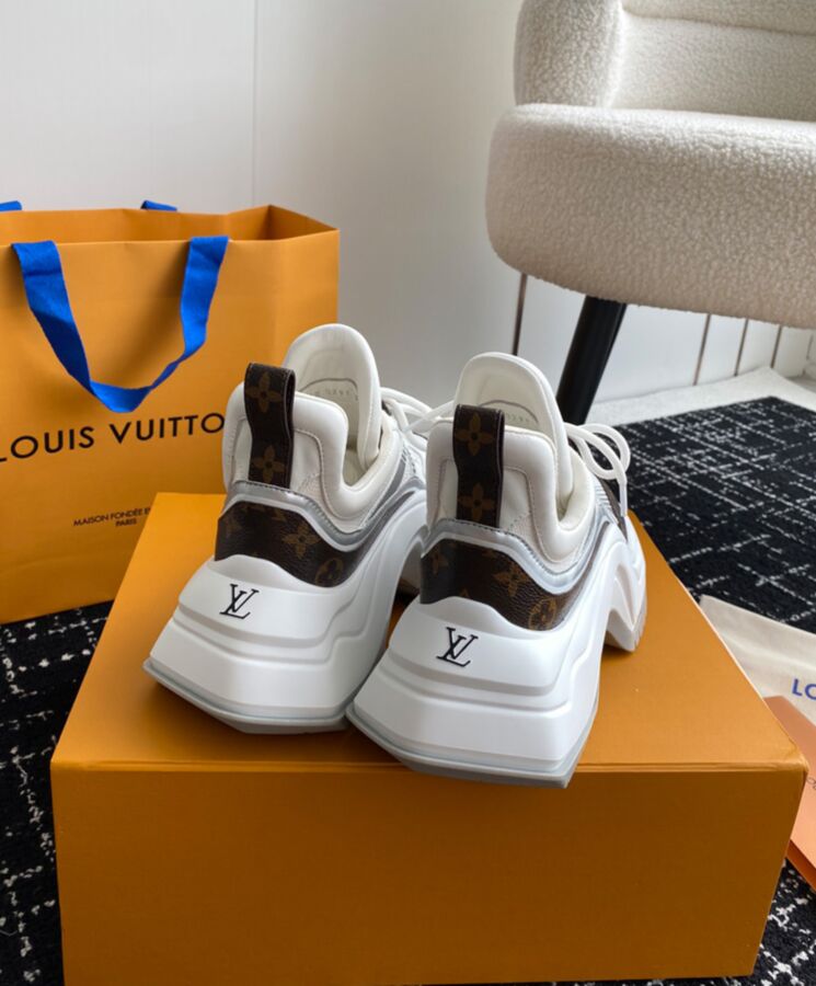 The LV Archlight 2.0 platform sneaker takes inspiration from the cult LV Archlight sneaker, designed by Nicolas Ghesquiere. This version comes in a mix of technical materials with trim in Louis Vuitton’s iconic Monogram canvas. This on-trend style is notable for its graphic, oversized outsole and exaggerated tongue, which is signed with an LV Circle logo.