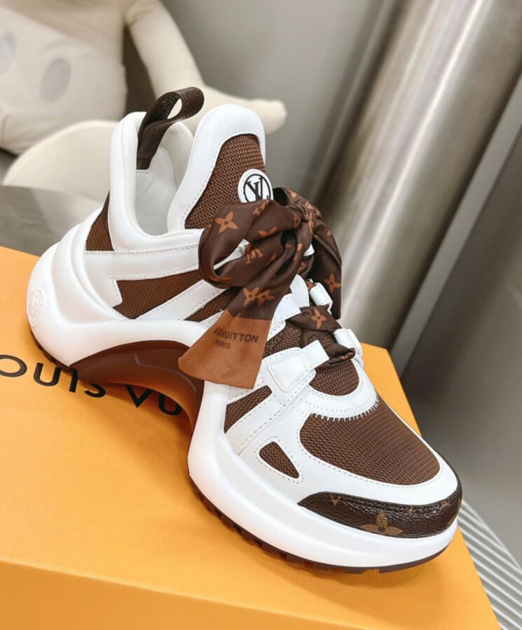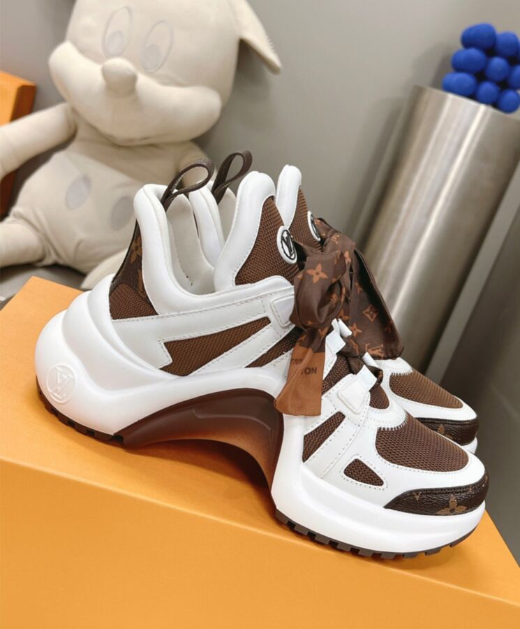 The iconic LV Archlight sneaker is revisited with rich signature details, including patent Monogram canvas and Monogram ribbon laces. The upper combines white calf leather with technical mesh, while the bouncy, wave-shaped outsole is highlighted in brown. Other key features of this design are its oversized tongue and feminine low cut around the ankle.