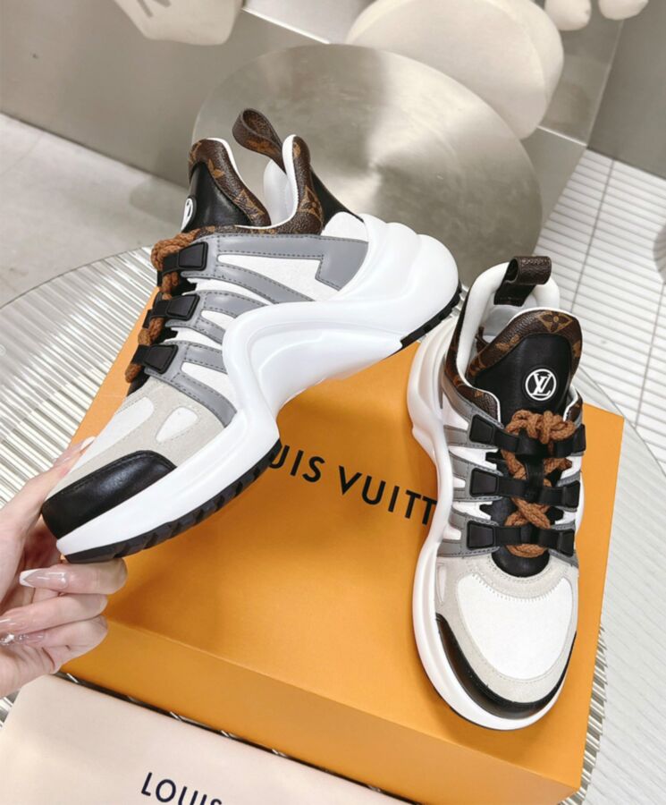 This reinterpretation of the LV Archlight sneaker pairs velvety suede calf leather with trim in smooth calf leather and Monogram canvas. This iconic model is instantly recognizable for its oversized tongue and bouncy, wave-shaped outsole, both signed with the LV Circle logo. Double laces in thick cotton complement this design.